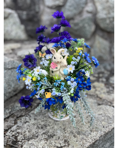 Ikebanka v modrom Cena 25,00 € Ikebanka robená do plechovej nádoby s párikom zajacov doplnená kvietkami v modrých odtieňoch. Výška 37 cm, priemer 25 cm.
