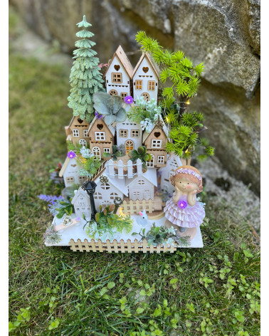Dedinka s fialovým dievčatkom Cena 48,00 € Dedinka s drevenými domčekmi, s fialovým dievčatkom, s balkónom, so stromami a s dreveným plotom. Dedinka je podsvietená. Dĺžka 24 cm, šírka 18...