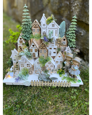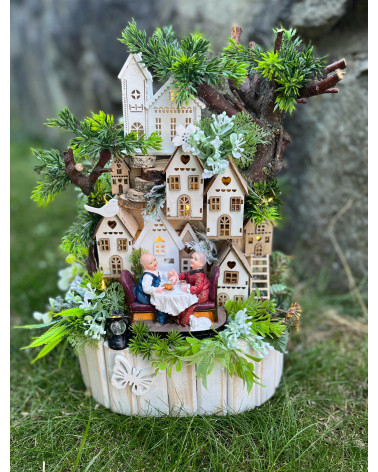 Dedinka babka s dedkom Cena 59,00 € Dedinka robená do drevenej oválnej nádoby s babkou a s dedkom, ako si spolu pijú kávičku. Dedinka je plná drevených domčekov, s množstvom doplnkov...