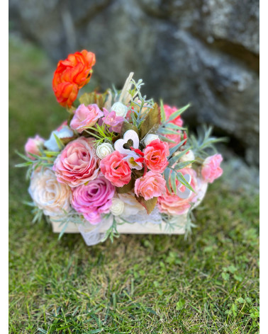 Ikebana kvetinová Cena 22,00 € Ikebana v ružových odtieňoch v drevenej nádobke so srdiečkami. Milá aj ako darček. Dĺžka 26 cm, šírka 18 cm, výška 25 cm.
