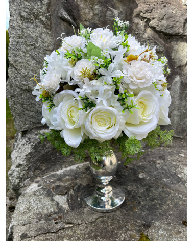 Ikebana na striebornej nohe Cena 58,00 € Biela ikebana v tvare gule na keramickej striebornej nohe, bohato robená, vhodná po celý rok. Výška 43 cm, priemer kytice 30 cm.