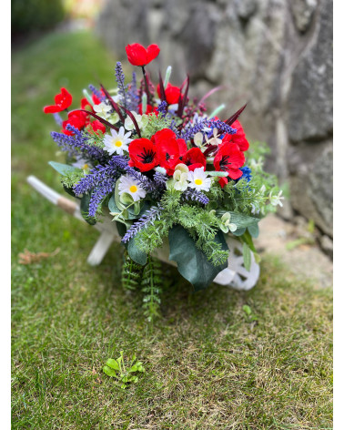Fúrik plný kvetov Cena 39,00 € Drevený biely fúrik plný zelene, makov, nevädze a sedmokrások. Dĺžka 40 cm, šírka 30 cm, výška 36 cm.
