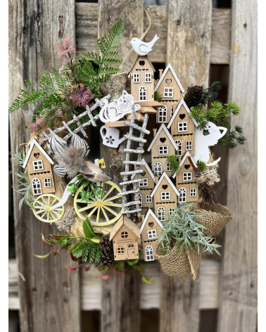 Domčekový veniec Cena 29,00 € Slamenný veniec s drevenými domčekmi, s dreveným bicyklom, s rebríkom, plný drobností. Priemer venca 35 cm.
