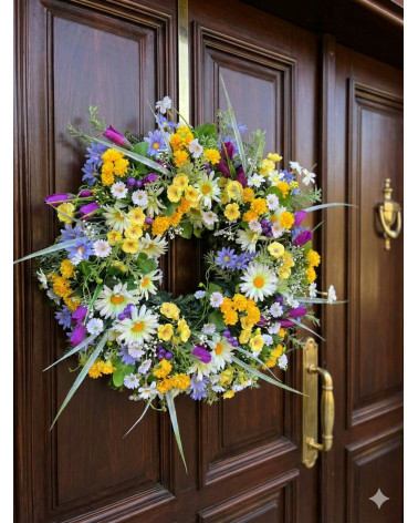 Lúčny veniec Cena 44,00 € Veľký lúčny veniec s drobnými kvietkami a trávami v jemných farbách. Priemer 46 cm.
