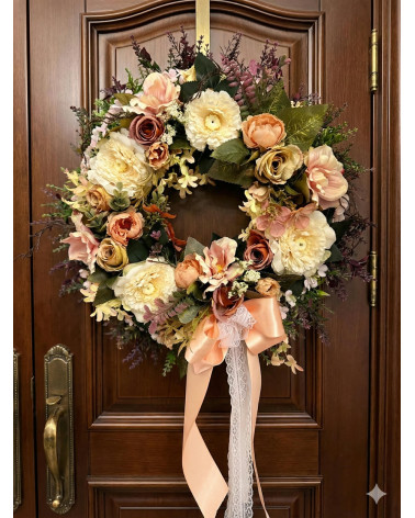 Kvetinový veniec Vintage Cena 48,00 € Veniec nielen na dvere plný nádherných kvetov vo vintage štýle, aktuálny od jari až do jesene. Materiál: umelé kvety, mašle. Priemer venca 48...