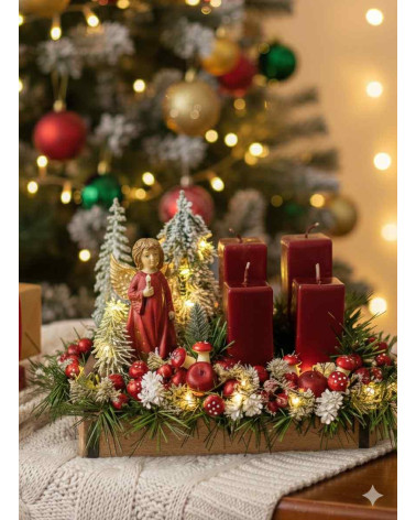Adventný svietnik s anjelikom Cena 55,00 € Adventný veniec v červeno vínových farbách s anjelikom, ktorý si drží sviečku, je robený do drevenej nádoby plnej zamrznutej čečiny a primrznutých...