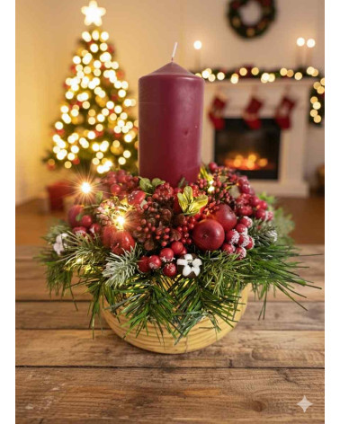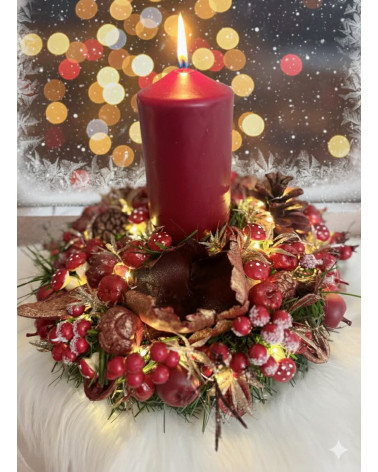 Svietnik na jednu sviečku Cena 48,00 € Svietnik s hrubou bordovou sviečkou, s množstvom drobných ozdôbok. Svietnik je podsvietený svetielkami na baterky, ktoré sú súčasťou dekorácie....