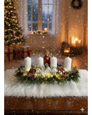 Adventný svietnik s anjelom Cena 69,00 € Adventný svietnik robený do dreveného bieleho základu plného zamrznutej čečiny, bobuľami, s drevenými domčekmi a červeným anjelikom so zlatými...