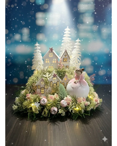 Zimná dedinka s ružovým... Cena 43,00 € Zimná dedinka s ružovým anjelikom v krásnej sukni, bohato zdobená zimnou zeleňou, drevenými domčekmi. Celá dekorácia je podsvietená svetielkami na...