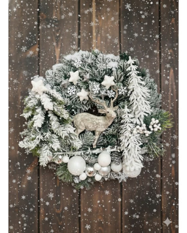 Zimný venček s jeleňom Cena 33,00 € Zasnežený venček s jeleňom v bielom, s bielymi stromčekmi, aktuálny po celú zimu. Materiál: polyrezin, umelé kvety, umelá hmota Priemer 33 cm.