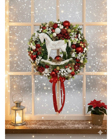 Vianočný veniec s koníkom Cena 57,00 € Čečinový veniec bohato zdobený s bielo červenými doplnkami, s červenou mašľou, s nádherným dreveným koníkom. Materiál: umelé kvety, drevo, umelá...