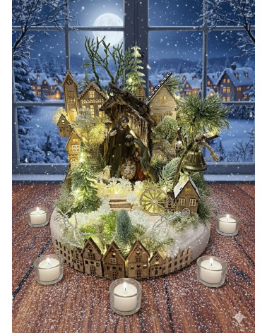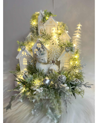 Zimná okrúhla dedinka... Cena 54,00 € Zimná dedinka robená dookrúhla, je vyvýšená na podstavci, s bielym jelenčaťom, s bielo striebornými doplnkami, s drevenými domčekmi a so...