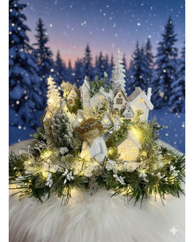 Zimná dedinka s anjelikom Cena 65,00 € Zimná dedinka s bielym anjelikom, s drevenými domčekmi, zdobená zamrznutou a zasneženou zeleňou. Dedinka je podsvietená svetielkami na baterky,...