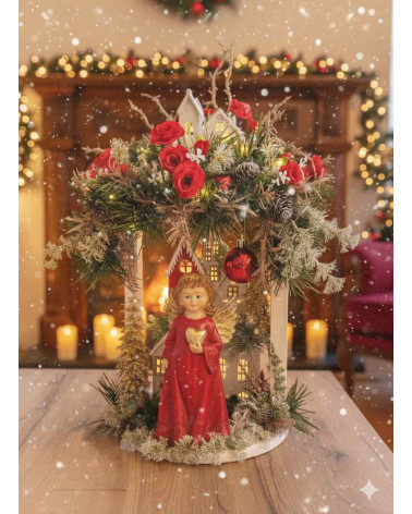 Dekorácia s anjelom Cena 59,00 € Drevený stojan s červeno zlatým anjelom, ktorý si drží sviečku. Je bohato zdobený, aj podsvietený svetielkami na baterky, ktoré sú súčasťou...