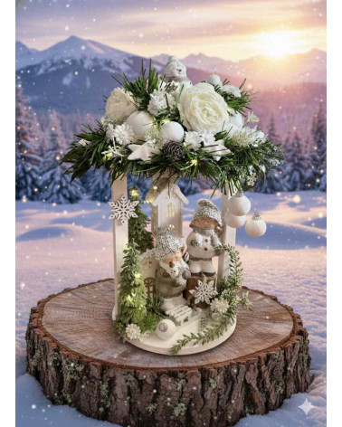 Dekorácia s detičkami Cena 59,00 € Okrúhly drevený stojan s bielo sivým párikom detičiek, bohato zdobený, na vrchu so snehuliačikom. Celá dekorácia je podsvietená svetielkami na...