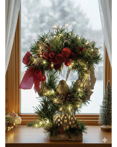 Stojatý veniec veľký Cena 54,00 € Drevený mohutný stojan ladený v zimno červenej kombinácii s keramickým vtákom, bohato zdobený čečinkou. Veniec je podsvietený svetielkami na...