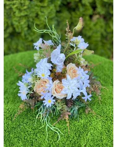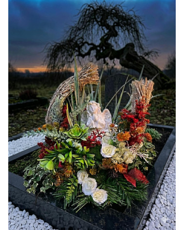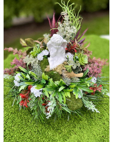 Kytica v poloblúku Cena 48,00 € Zaťažená kytica v prútenom poloblúku s anjelom so sukulentmi, trávami a listami. Výška 40 cm, dĺžka 35 cm, hĺbka 28 cm.