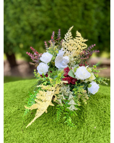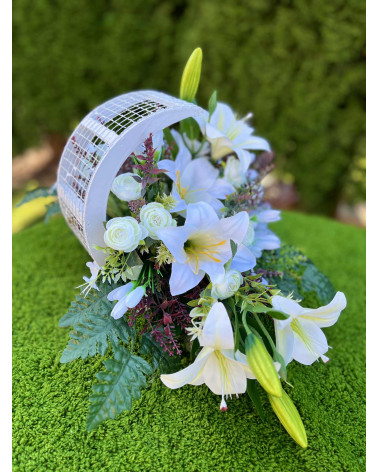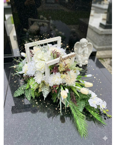 Veľká kytica v bielom Cena 88,00 € Bohato zdobená veľká kytica na drevenej konštrukcii, takže ju neodfúkne, v bielom doplnená zeleňou, s nápisom Spomíname. Výška 33 cm, dĺžka 50...