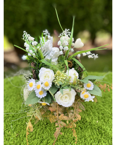 Malá kytička s anjelikom Cena 20,00 € Zaťažená kytička v prútenom košíku s bielym anjelikom, v čistých nežných farbách. Svojou veľkosťou je vhodná aj na urničku. Výška 23 cm, dĺžka 20...