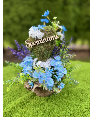 Malá kytička Cena 20,00 € Malá zaťažená kytička v modrom s nápisom Spomíname na machovom srdiečku. Výška 25 cm, priemer 24 cm.