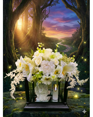 Panteón do biela zdobený Cena 43,00 € Tmavý panteón bohato zdobený s bielymi kvetmi a trávami. Vrch sa otvára, dovnútra sa vkladá anjelik alebo aj sviečky z večným svetlom. Zadná...