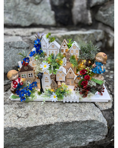 Dedinka s detičkami Cena 59,00 € Dedinka s dievčatkom a s chlapčekom, s drevenými domčekmi, podsvietenie je na baterky. Dĺžka 40 cm, šírka 18 cm, výška 25 cm.