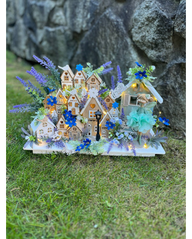 Dedinka s mentolovou vílou Cena 59,00 € Dedinka zo série Levanduľkova, s mentolovou vílou, s drevenými domčekmi, podsvietená na dve tuškové baterky s množstvom doplnkov. Dĺžka 40 cm,...