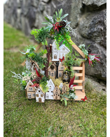 Dedinka so schodmi Cena 55,00 € Základom tejto dedinky je drevený domček so schodiskom doplnený o kostolík, drobné drevené domčeky, bicykel aj lampičku. Dedinka je podsvietená....