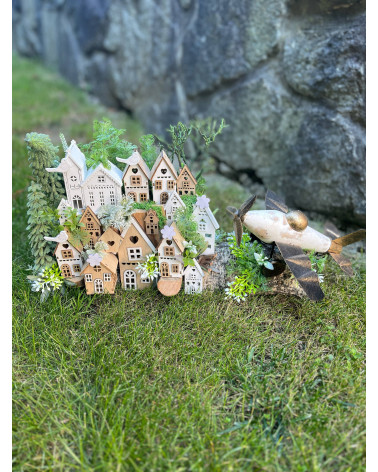 Dedinka s lietadlom Cena 29,00 € Dedinka s drevenými domčekmi, s lietadlom robená na dreve. Môže byť ako darček pre milovníkov lietadiel alebo lietania. Dĺžka 48 cm, šírka 20 cm,...
