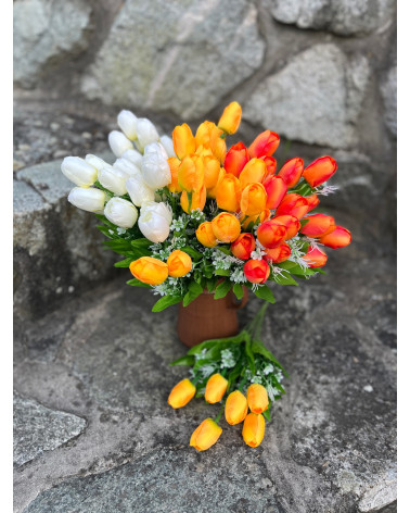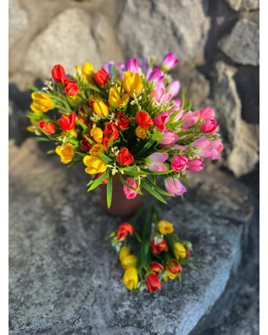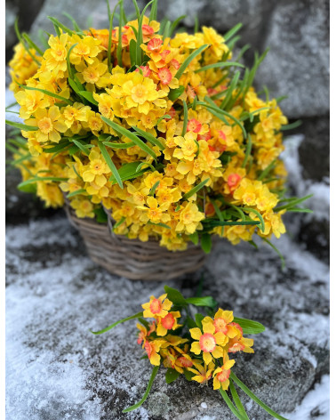 Narcisky Cena 1,65 € Kytička drobných narcisiek v žltej alebo v žlto oranžovej farbe. Dĺžka 27 cm, 5 stoniek.