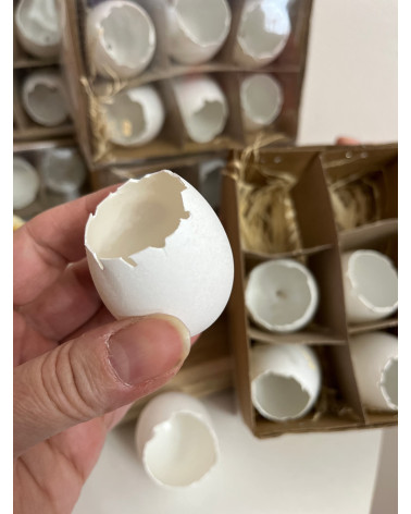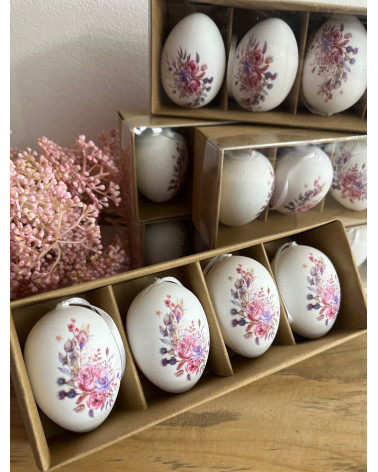 Vajíčka vintage Cena 1,95 € Biele umelé vajíčka na zavesenie s jemnými ružovo fialovými kvietkami. V sade sú 4 kusy. Výška vajíčka je 6 cm.