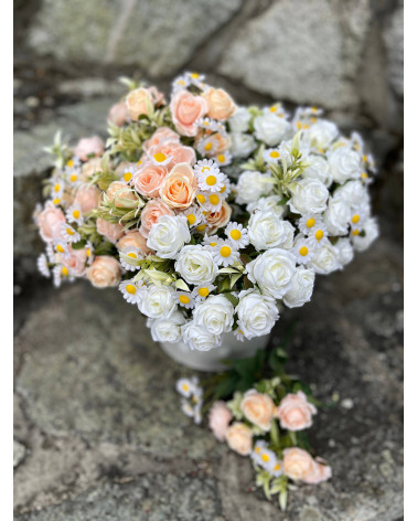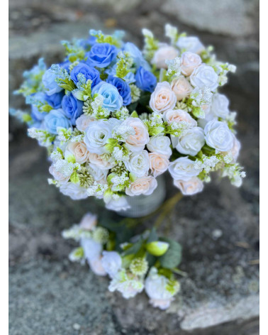 Kytička ružičky Cena 1,95 € Kytička v dvoch farbách, v bielo marhuľových odtieňoch alebo v odtieňoch modrej. Výška 35 cm.