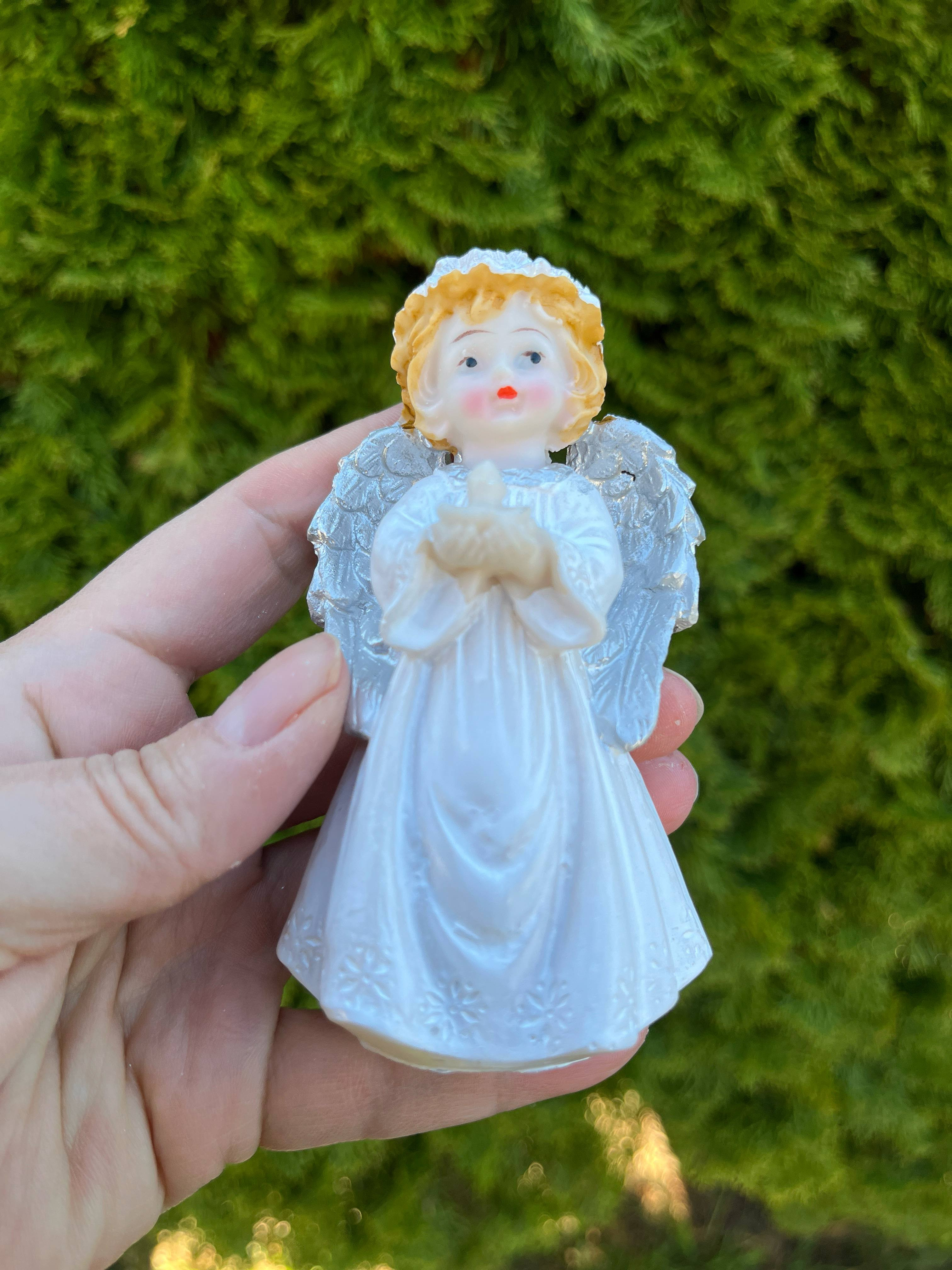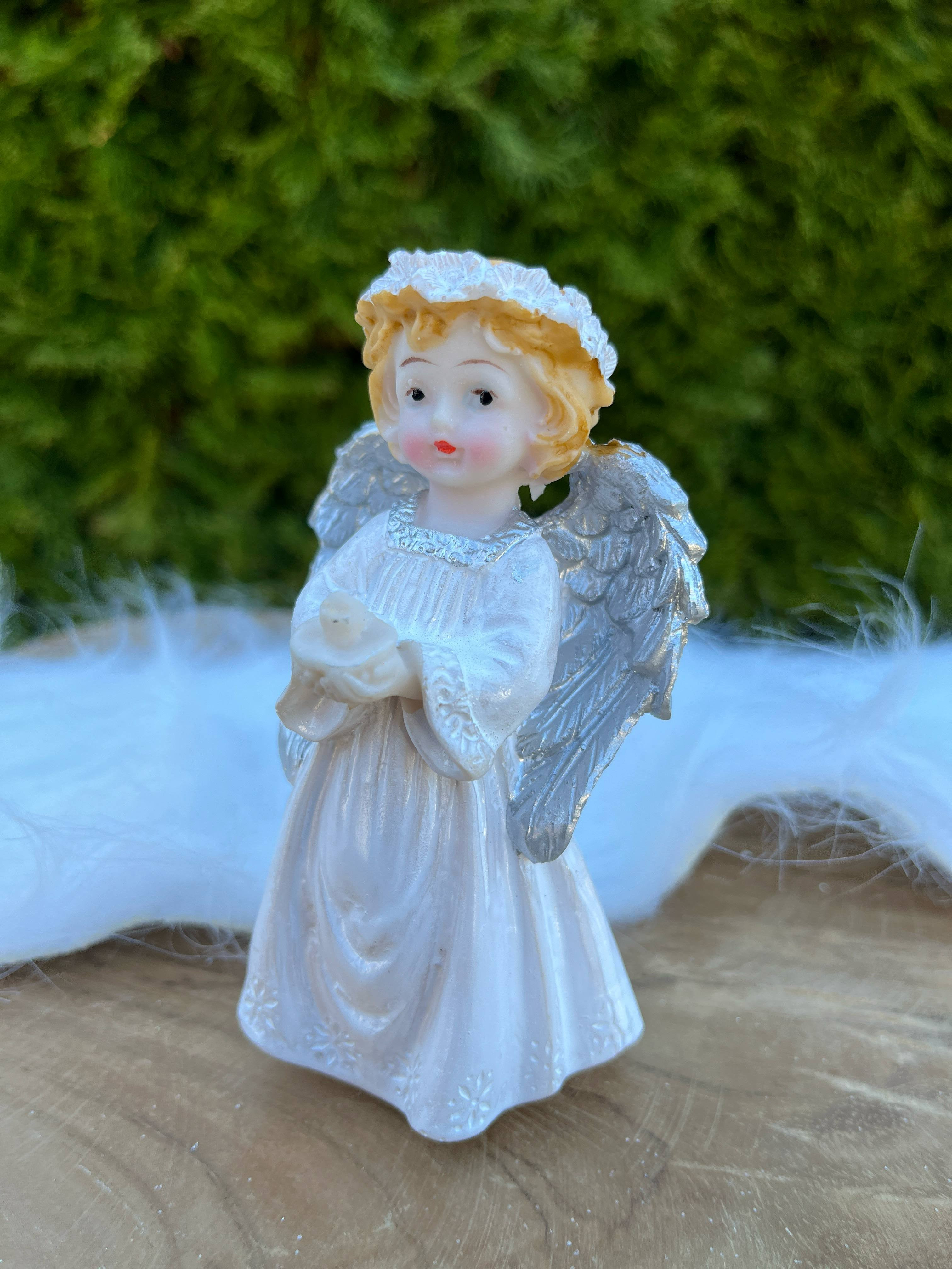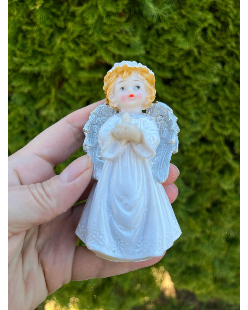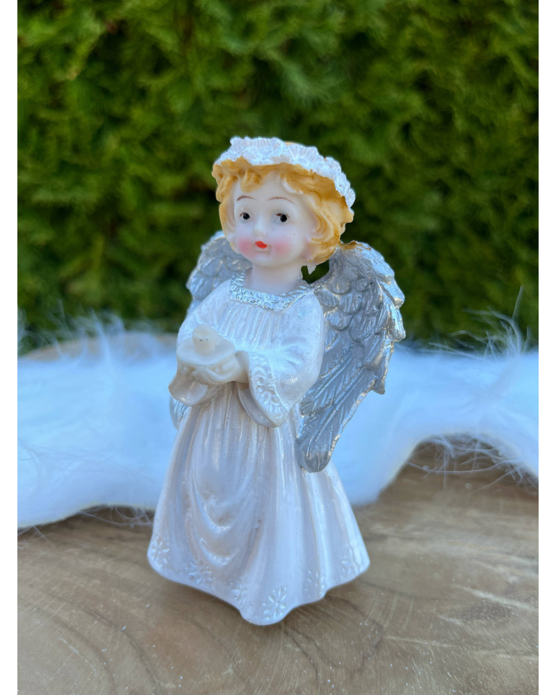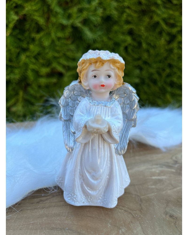 Anjelik biely z polyrezinu so striebornými krídlami, s bielou čelenkou, v ručičkách drží sviečku.