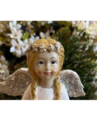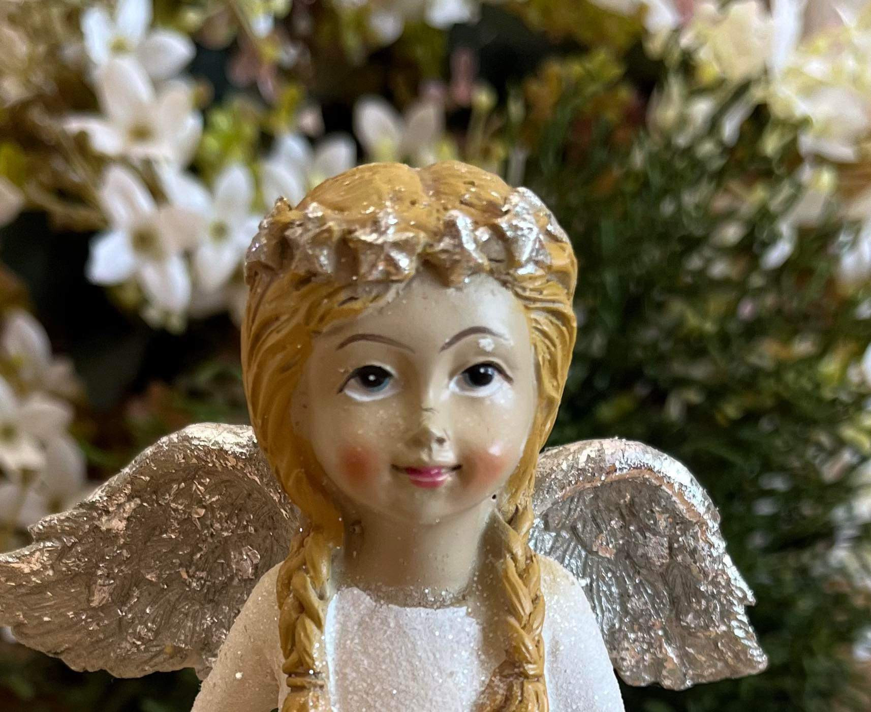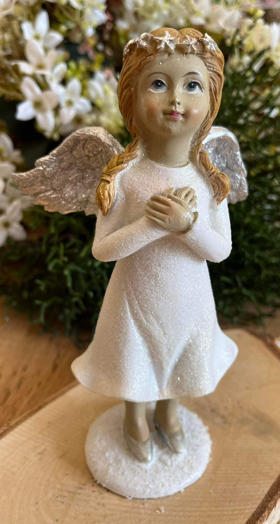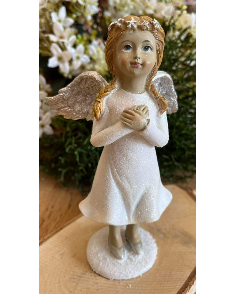Anjel v bielych ligotavých šatách s ligotavými striebornými krídlami, s venčekom na hlave, ruky má preložené na hrudi.