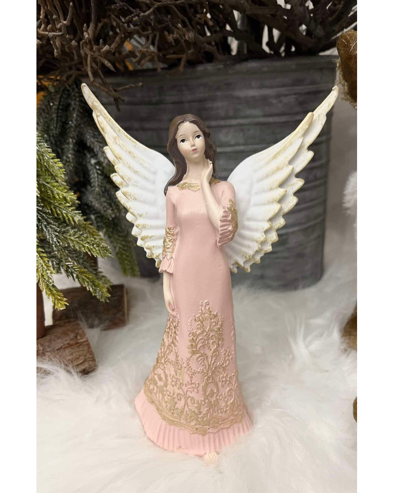 Anjel v jemne zdobených ružových šatách s kovovými krídlami. Krídla sa dajú zložiť.