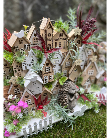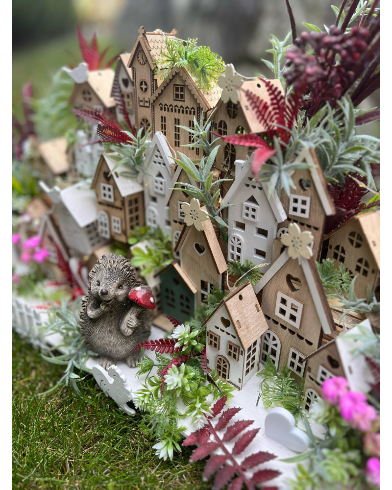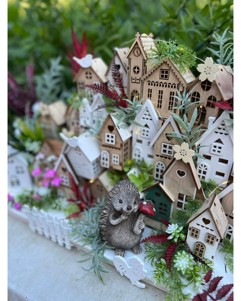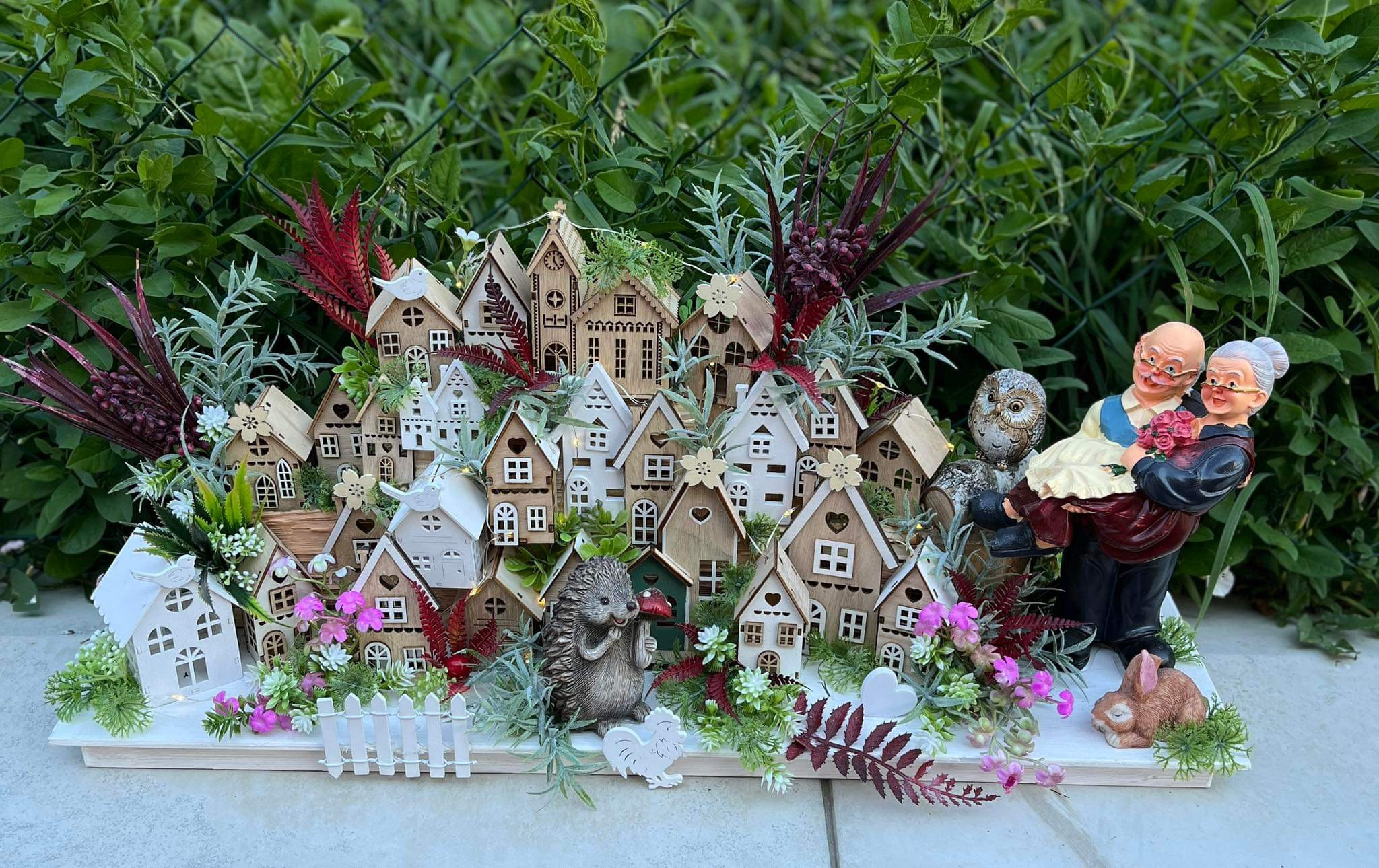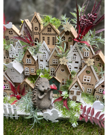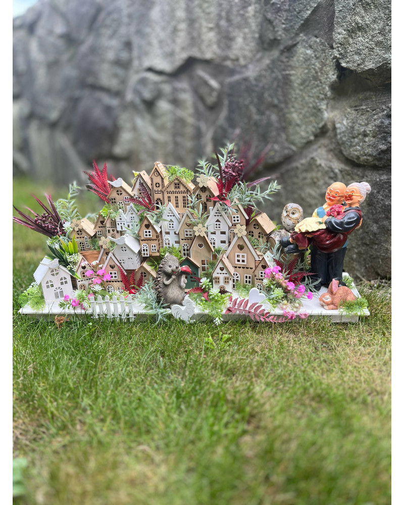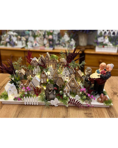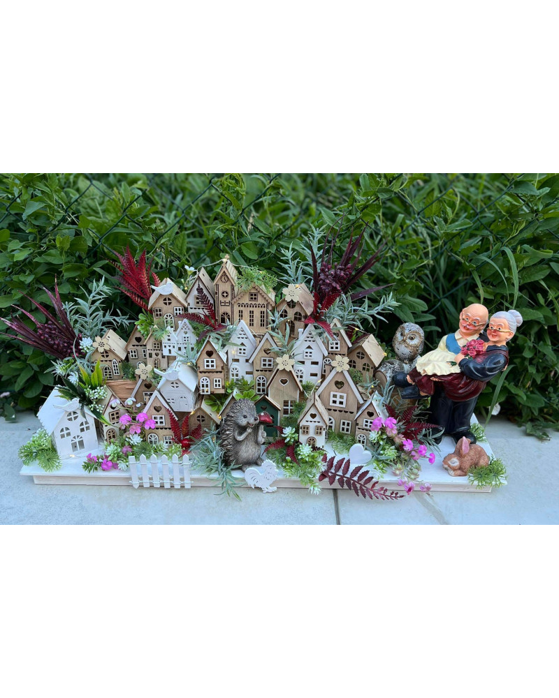 Veľká bohato zdobená dedinka plná drevených domčekov s keramickým ježkom aj zajkom, s chutnými dedkom a babkou.
