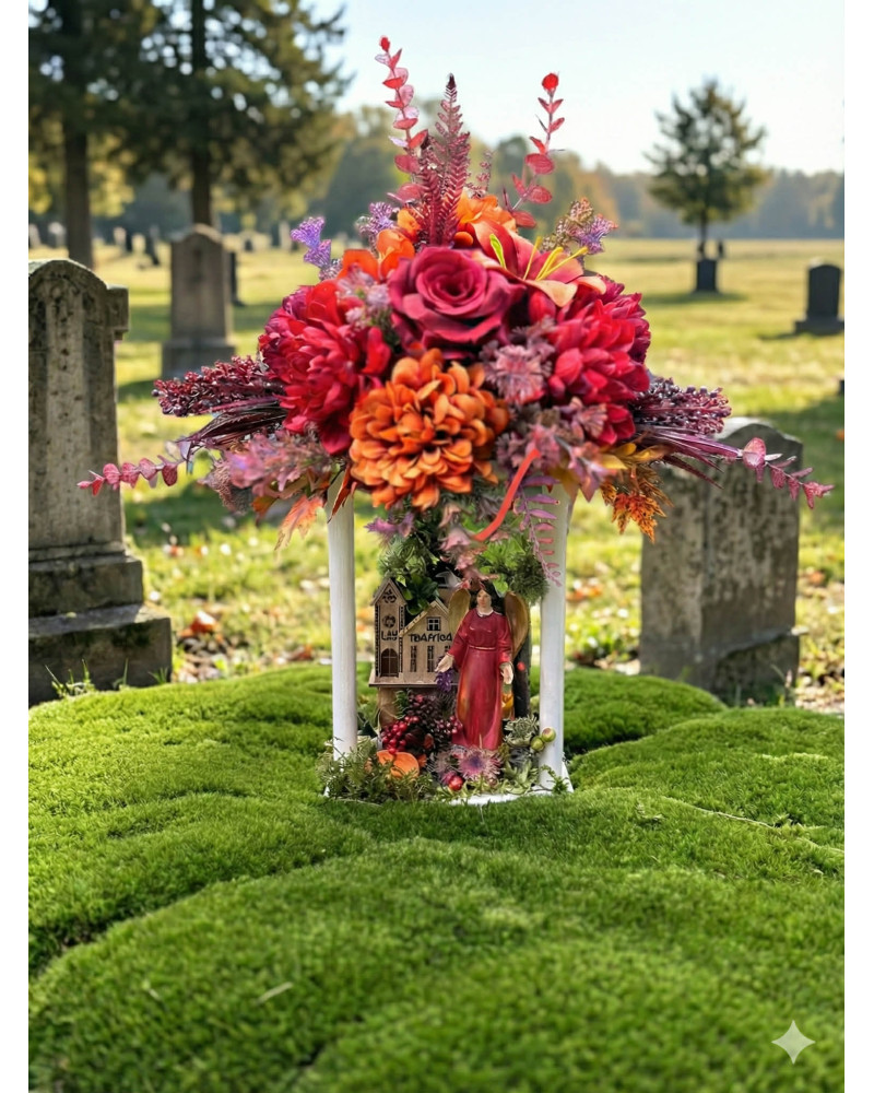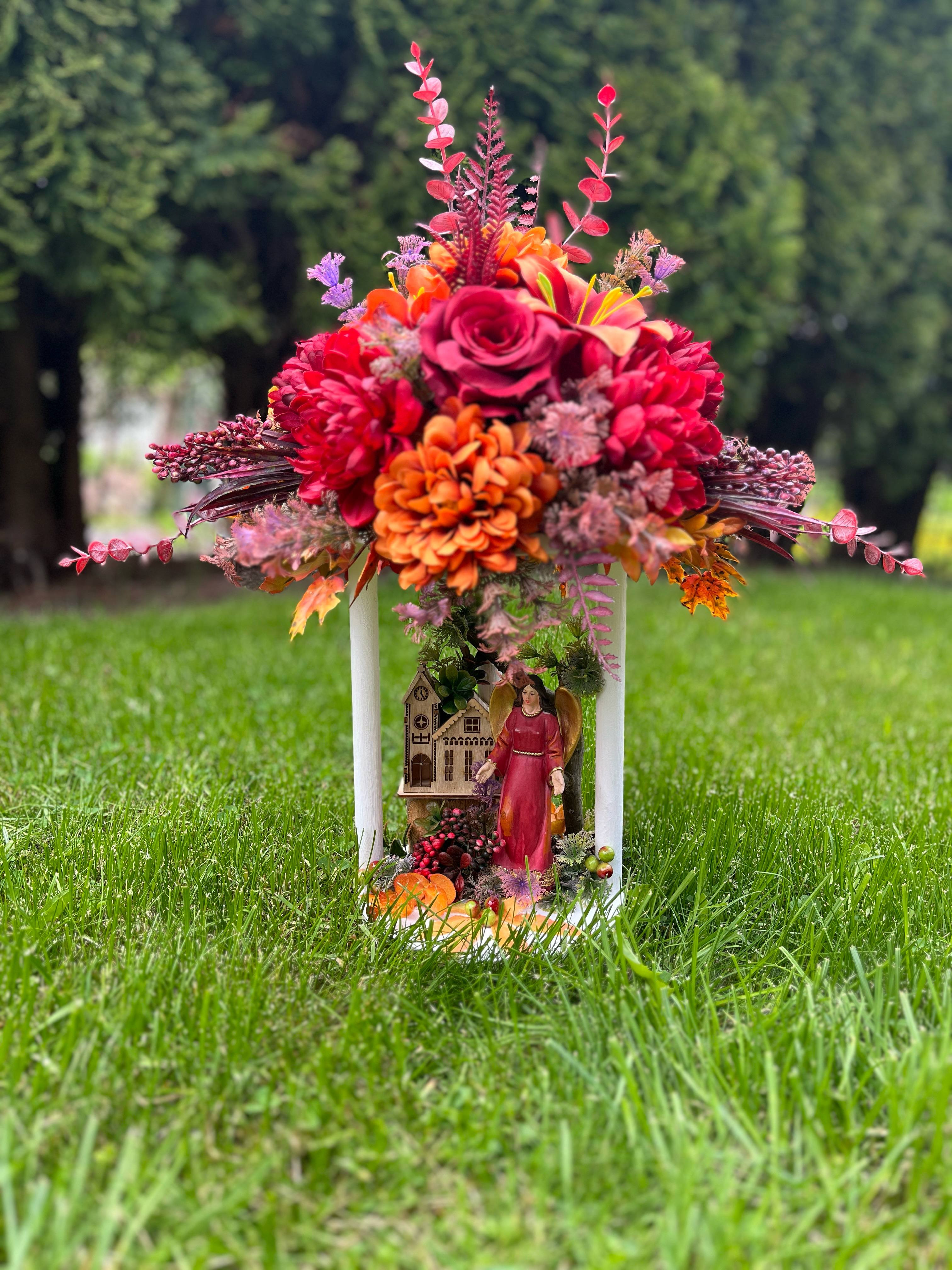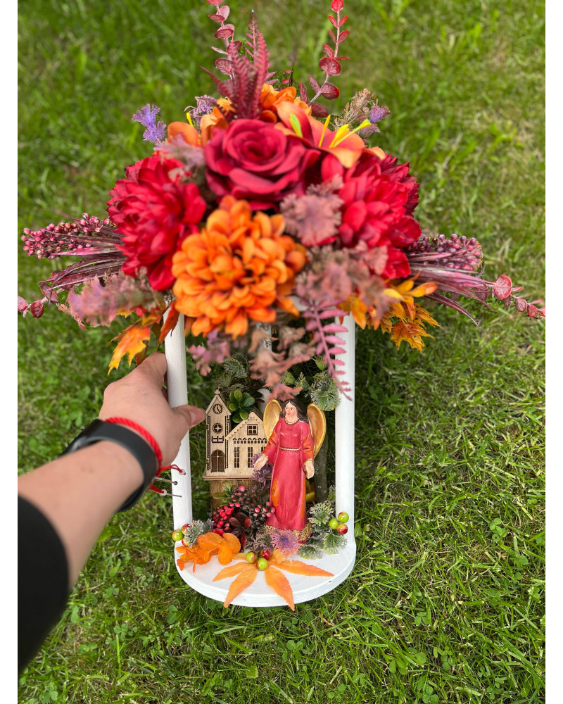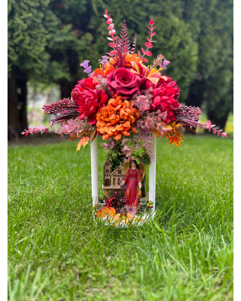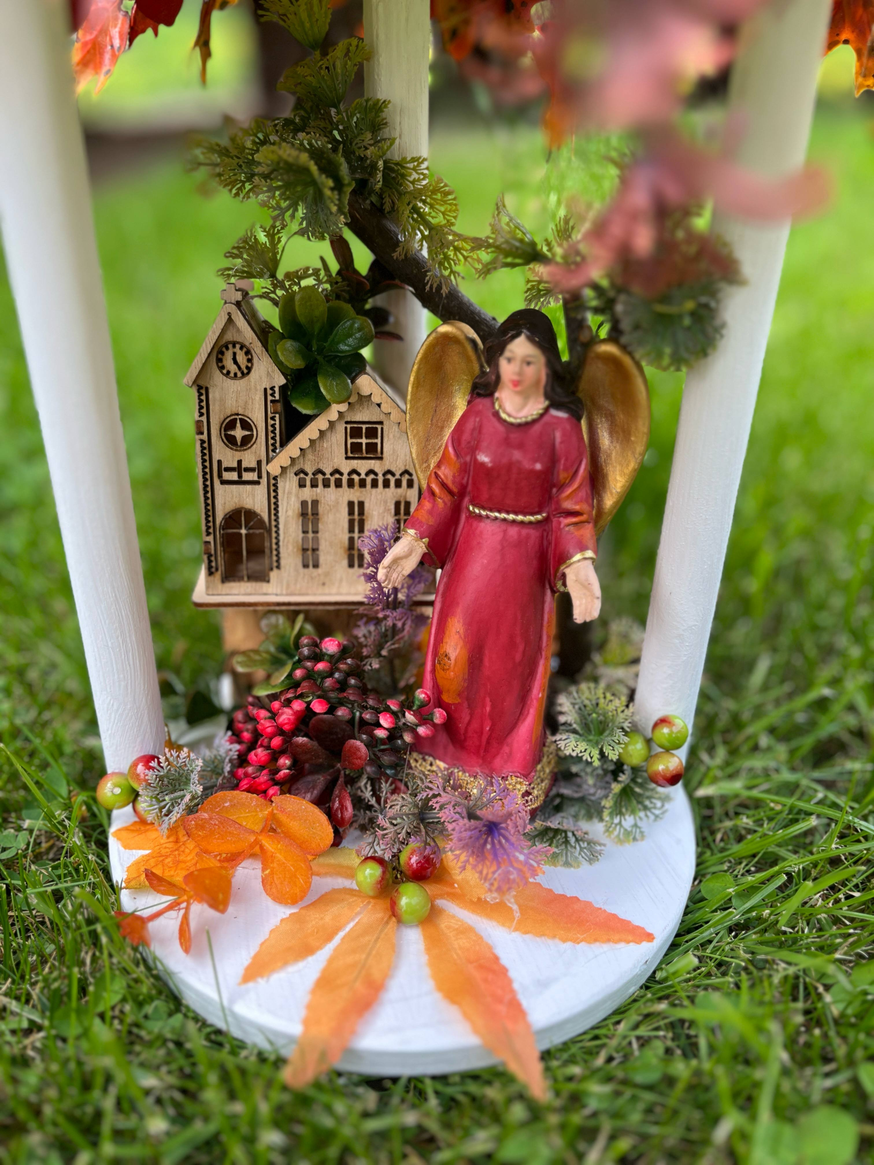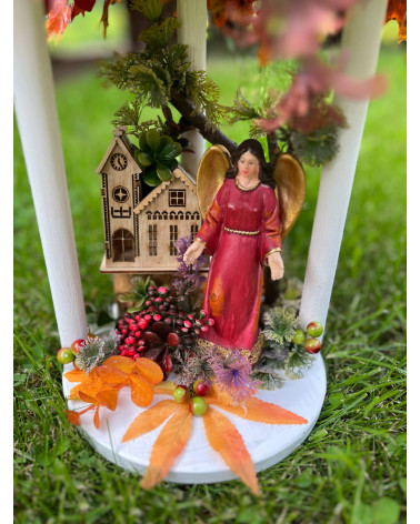 Drevený stojan s anjelikom v terakotovo bordových farbách, s dreveným kostolíkom, celý vrch je bohato zdobený.