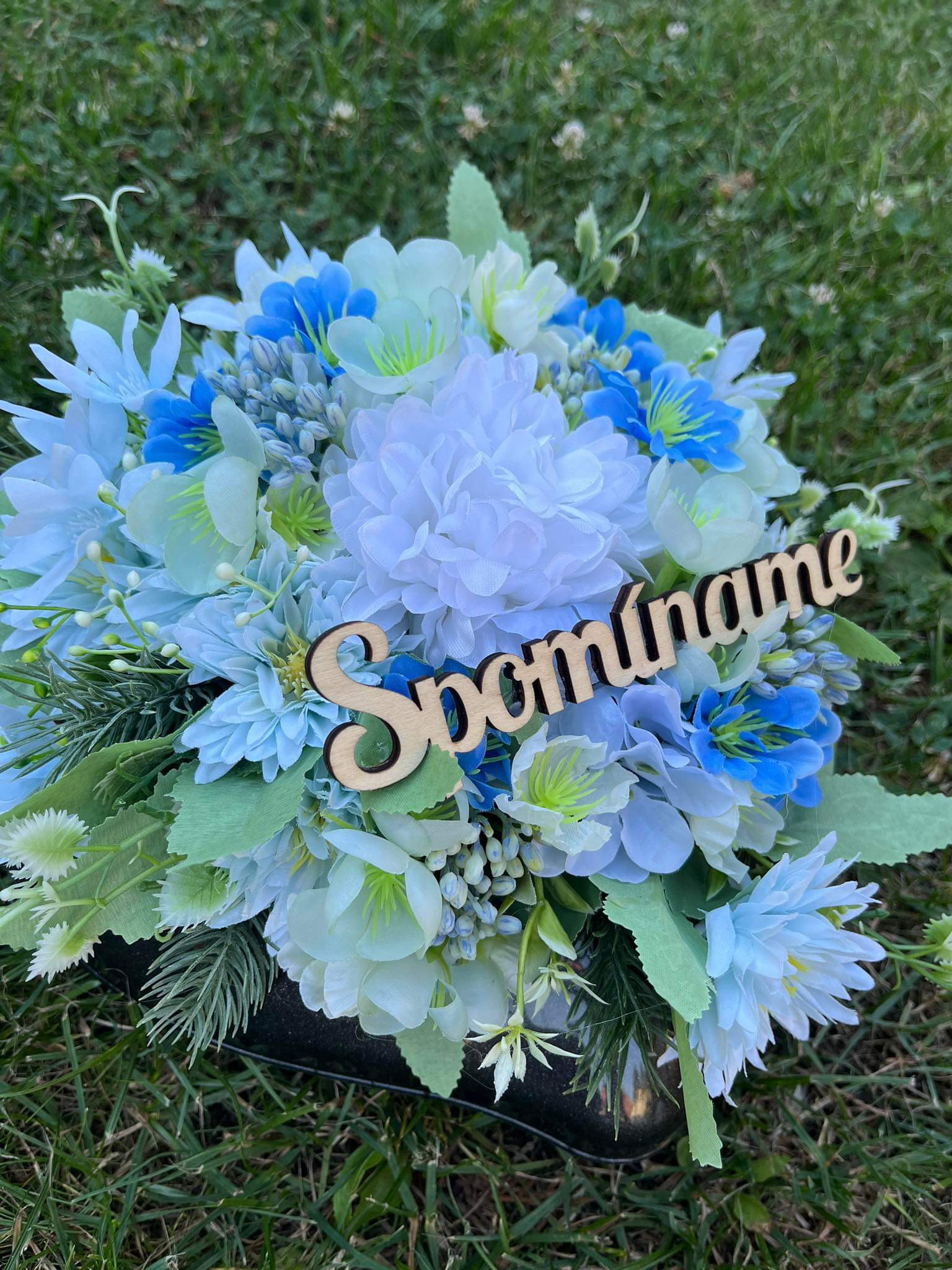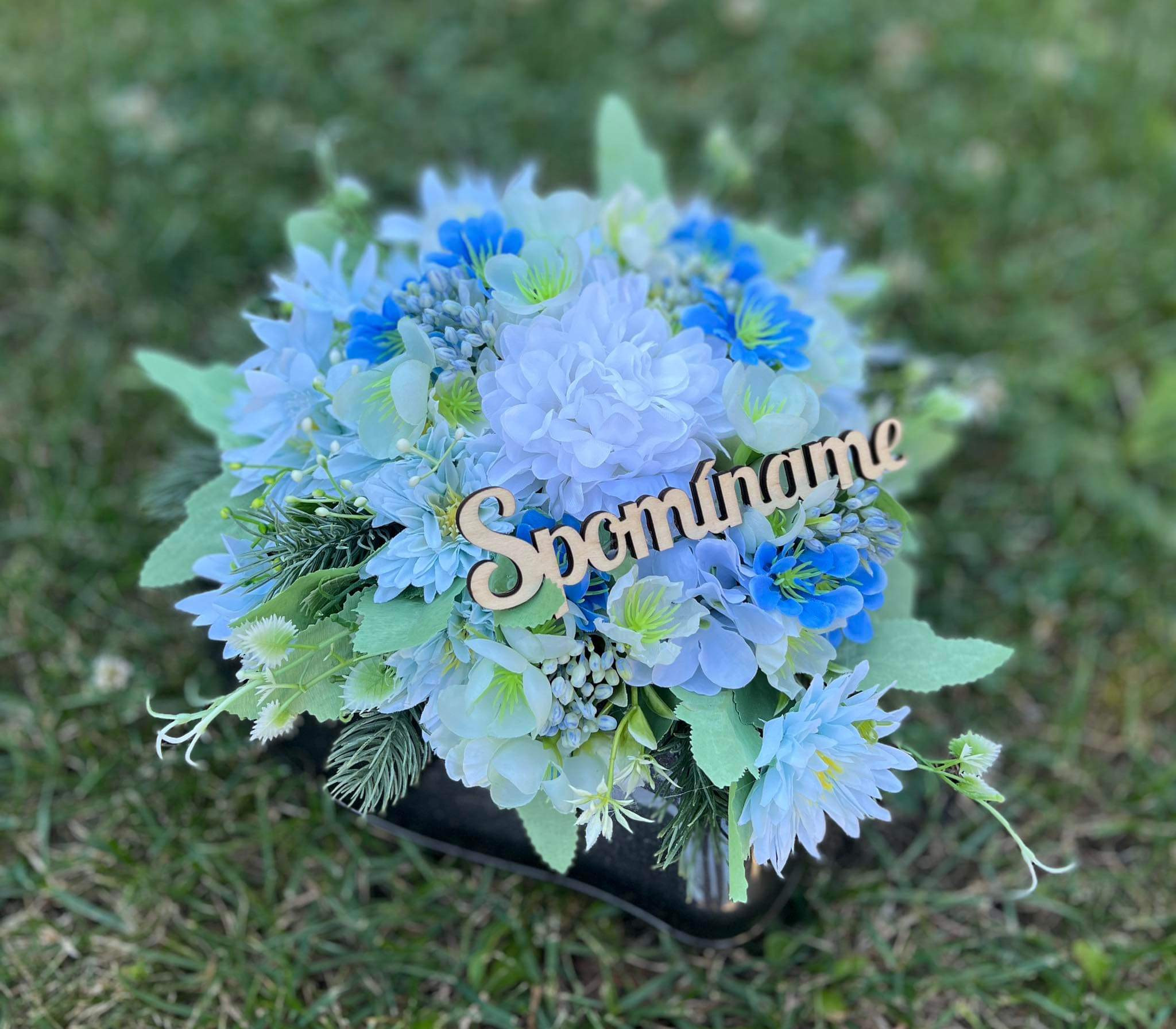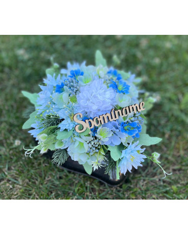 Ikebana robená do tvaru srdca do plastovej čiernej nádoby v modro bielej kombinácii.