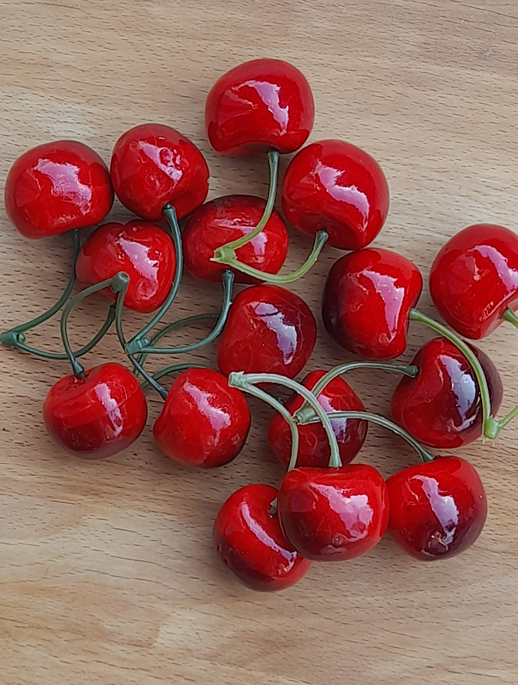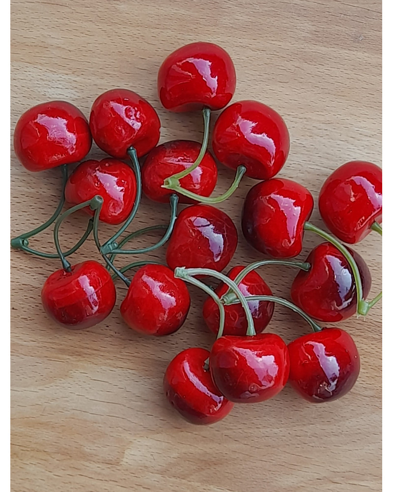 Umelé plody čerešne, plody sú spojené dve dohromady stonkami, vhodné na výrobu dekorácii. V balení je 8 párov, čiže16 kusov čerešní.