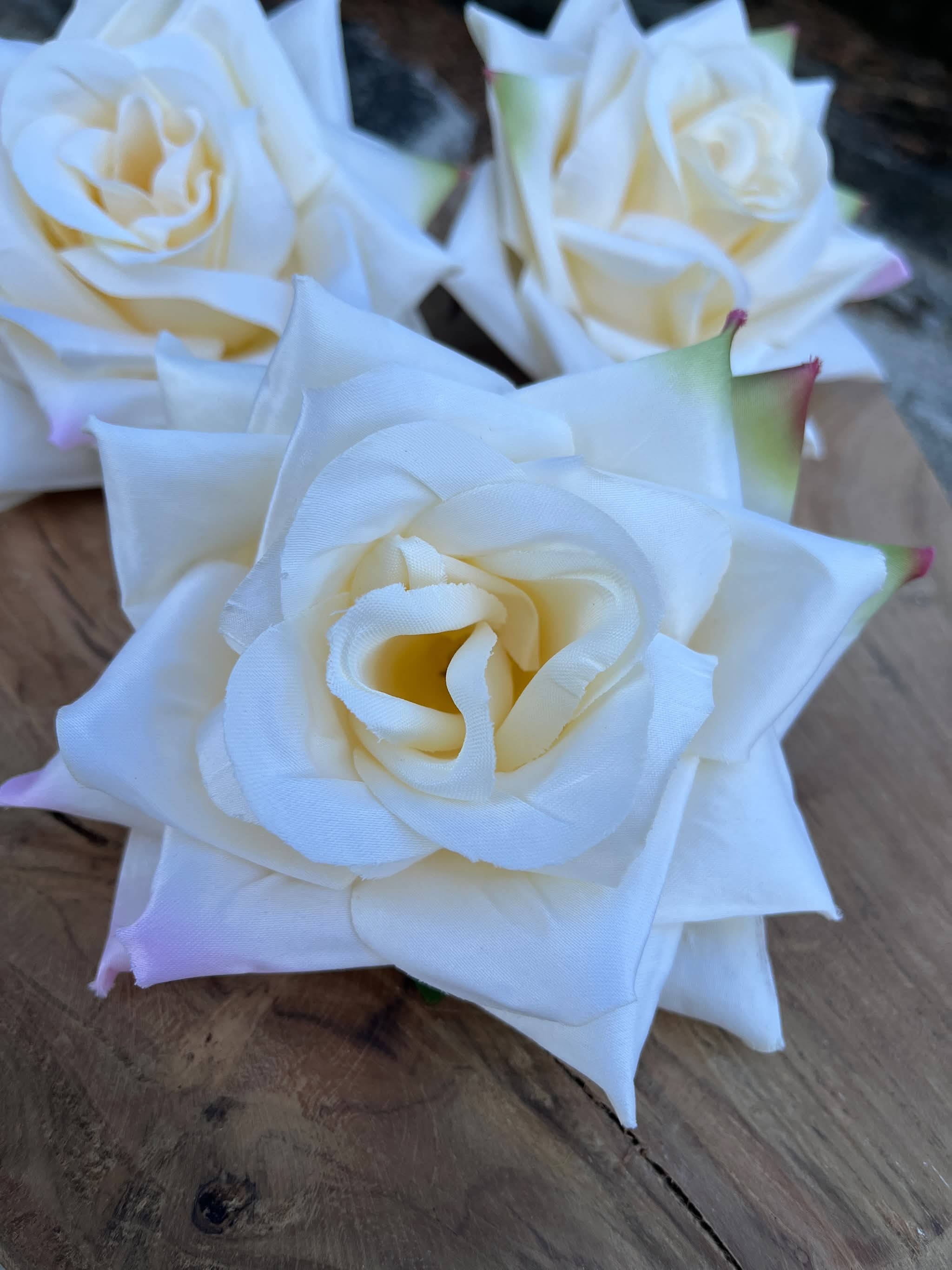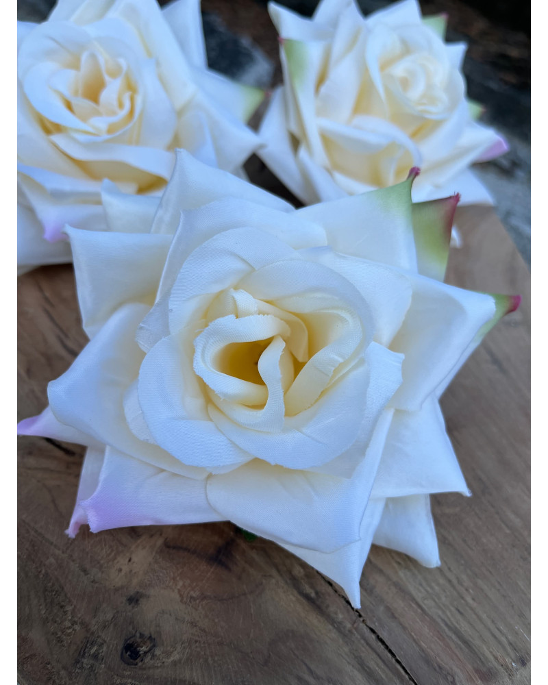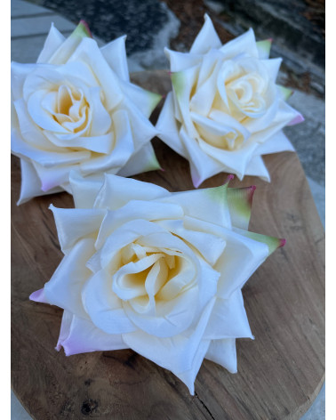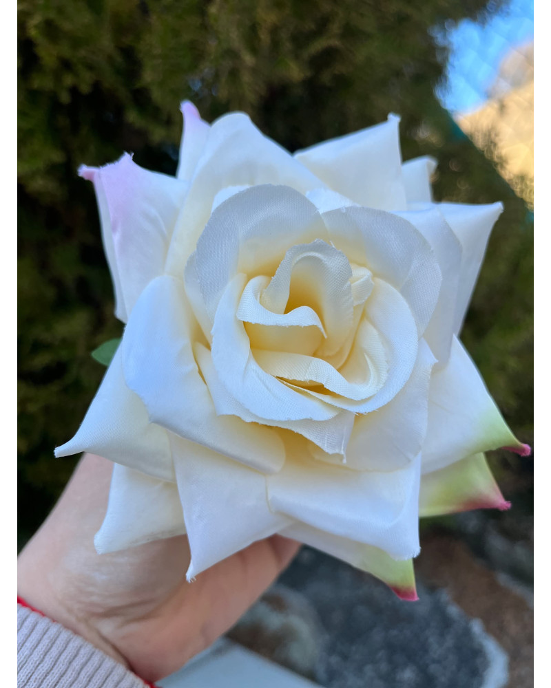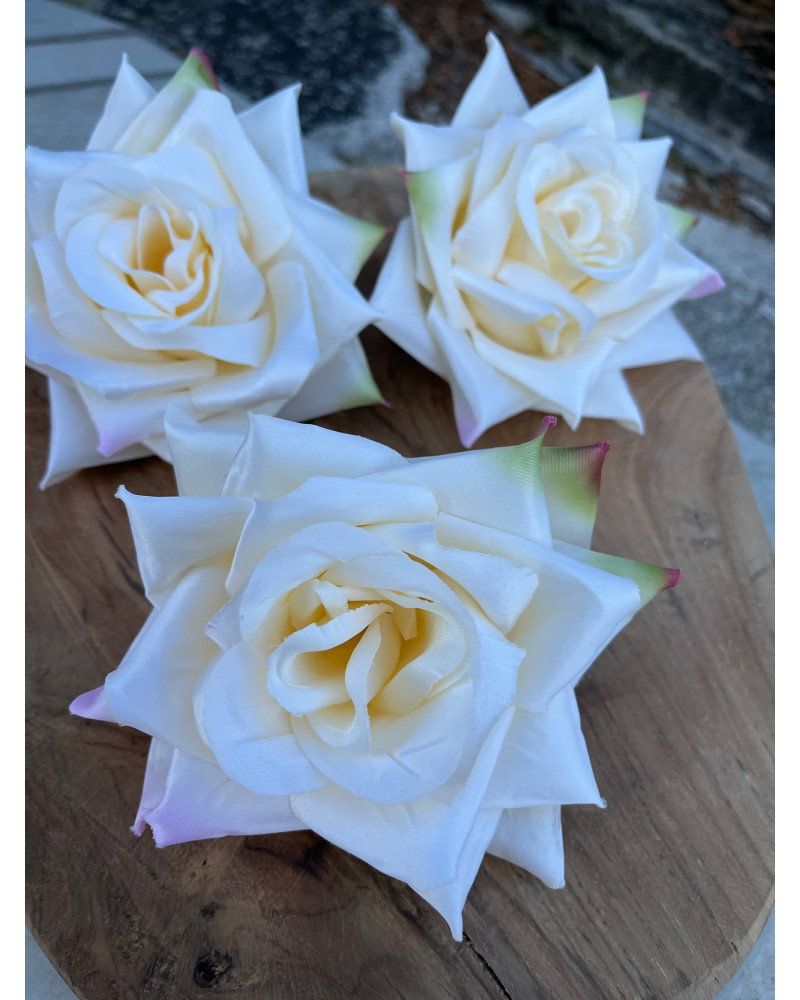 Hlavička kvetu ruže v maslovej farbe, po koncoch lupienkov ma jemné ružovkasté a zelené sfarbenie.