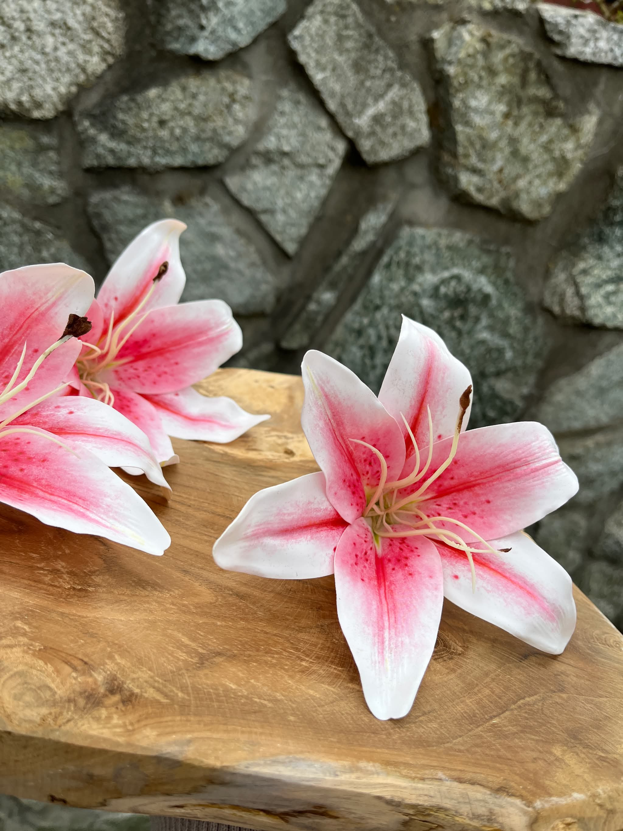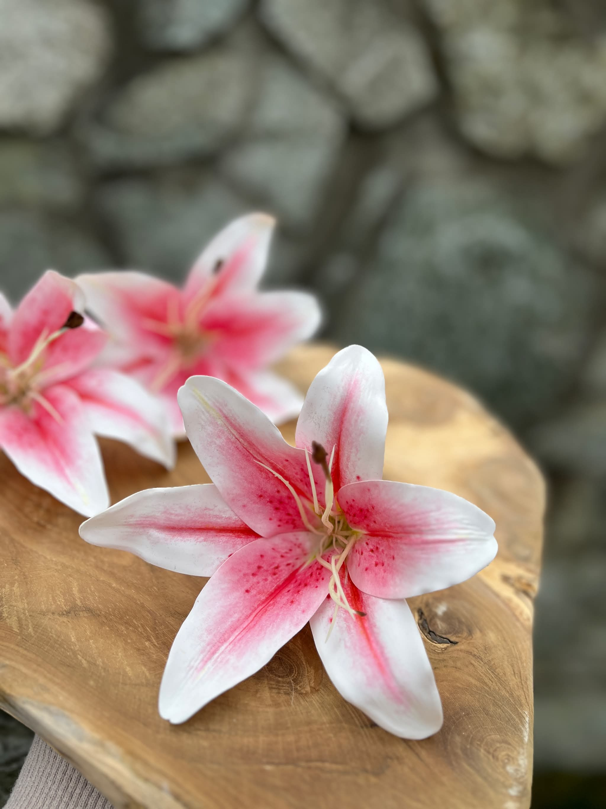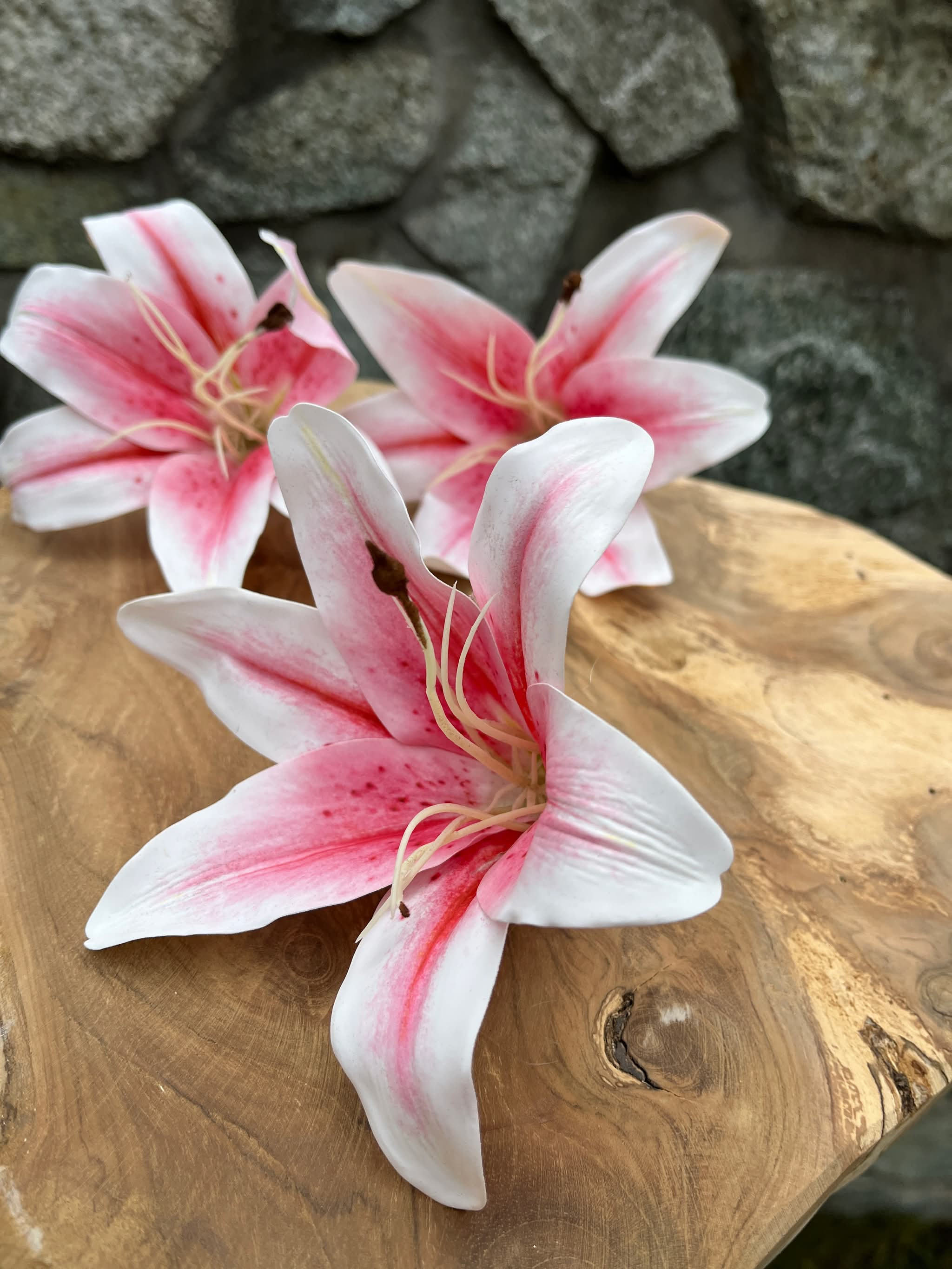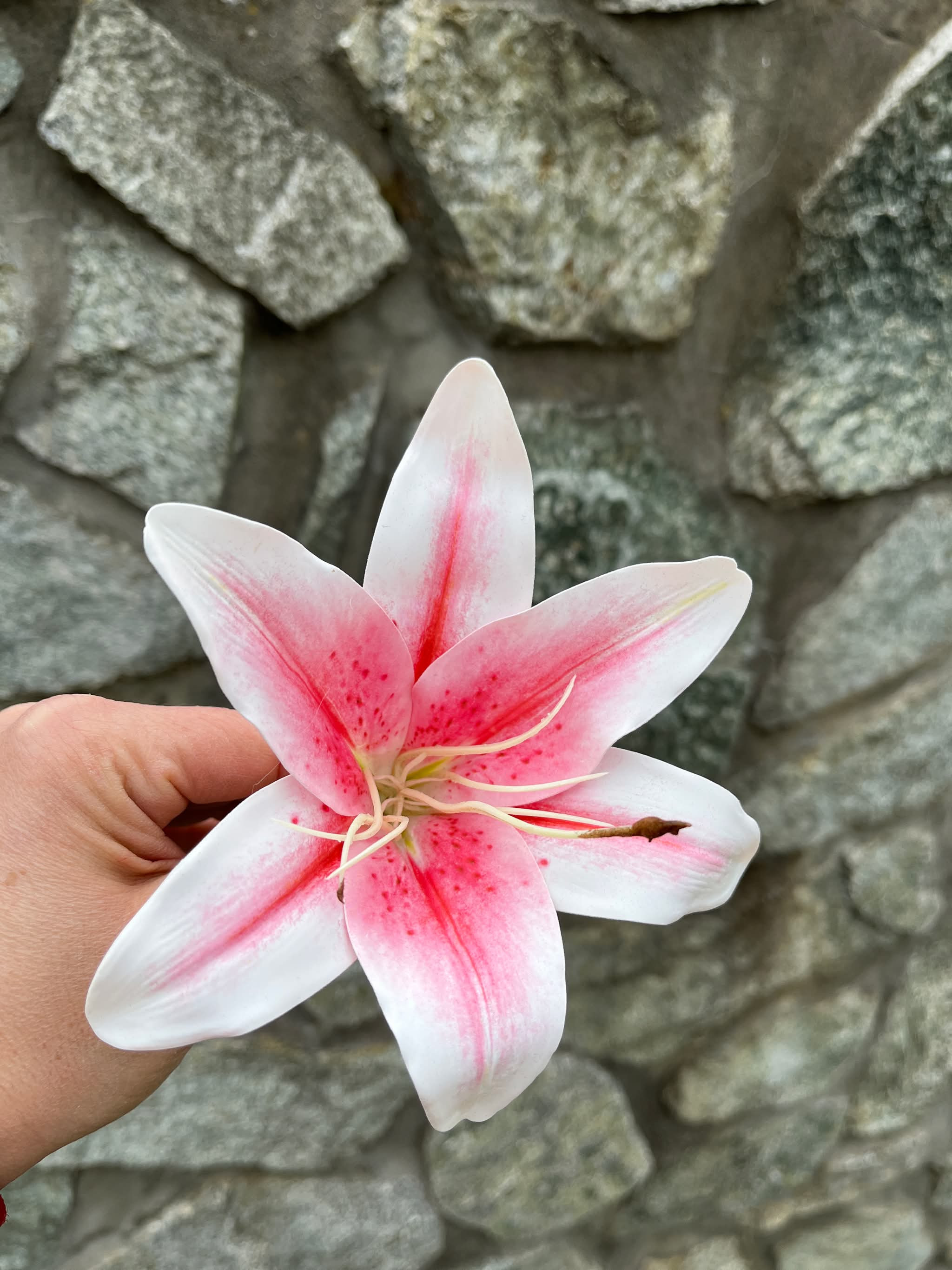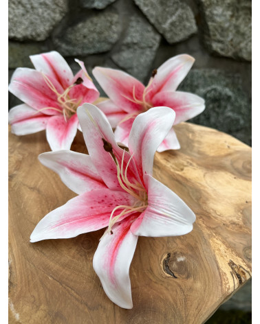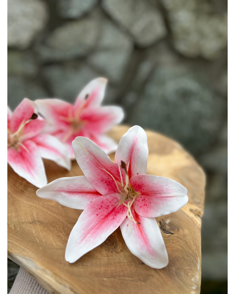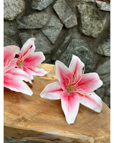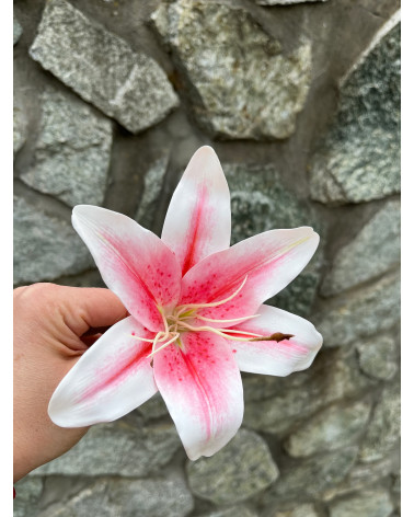 Hlavička kvetu rozkvitnutej biele ľaľie s ružovým, tento kvet je z gumy.