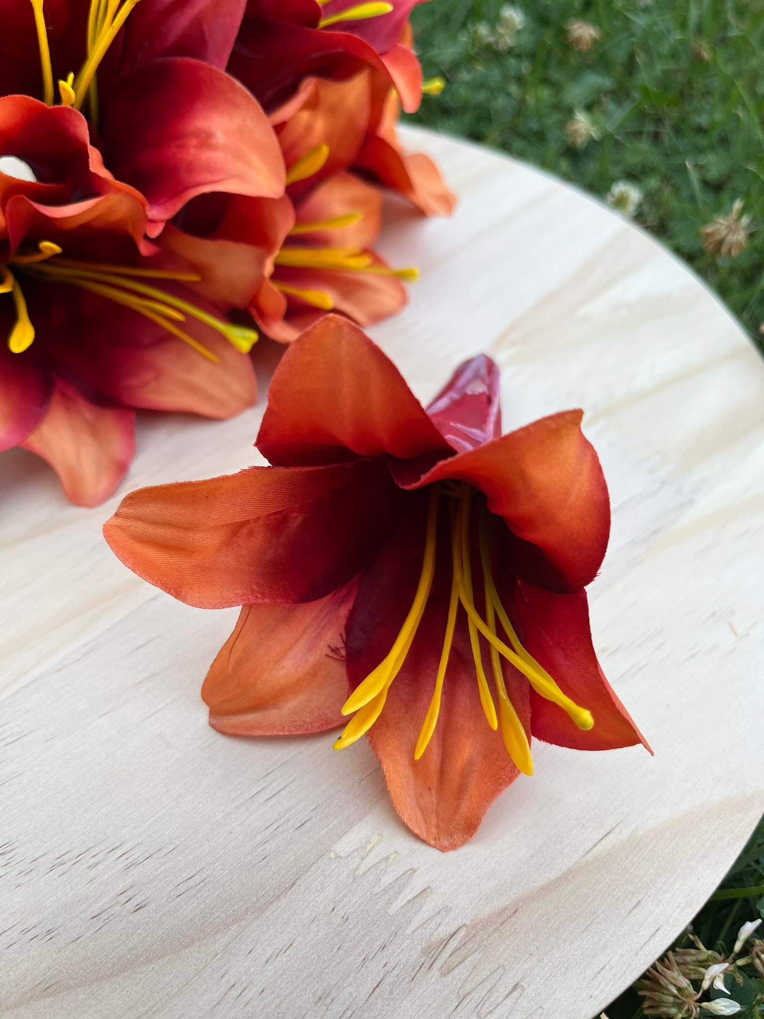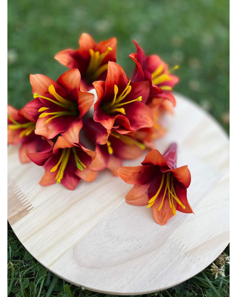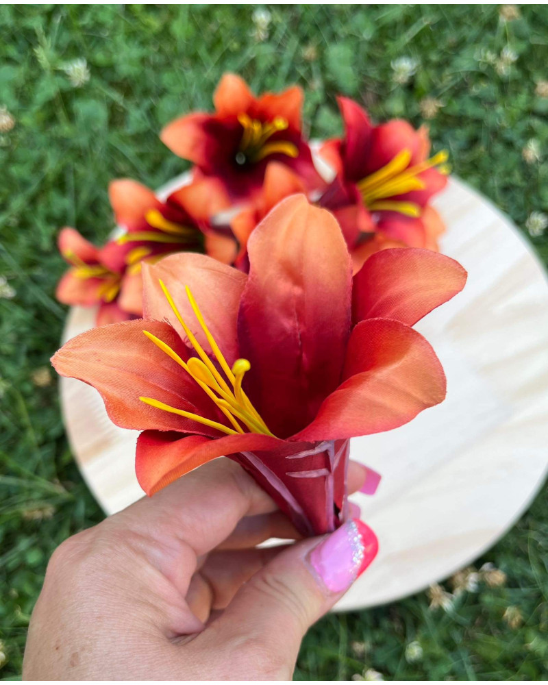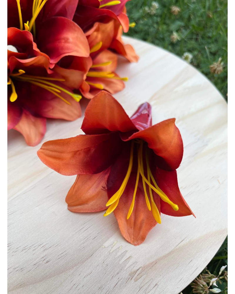 Hlavička kvetu ľaľie v oranžovej farbe, priemer 9 cm, dĺžka kalicha 10 cm.