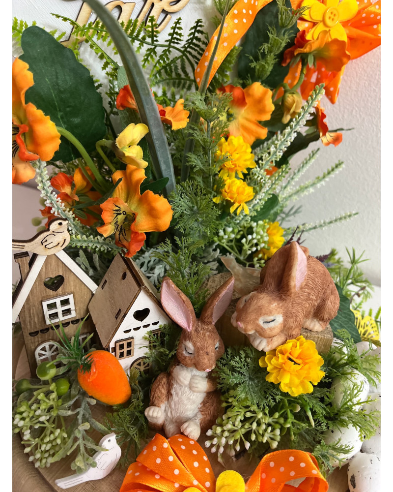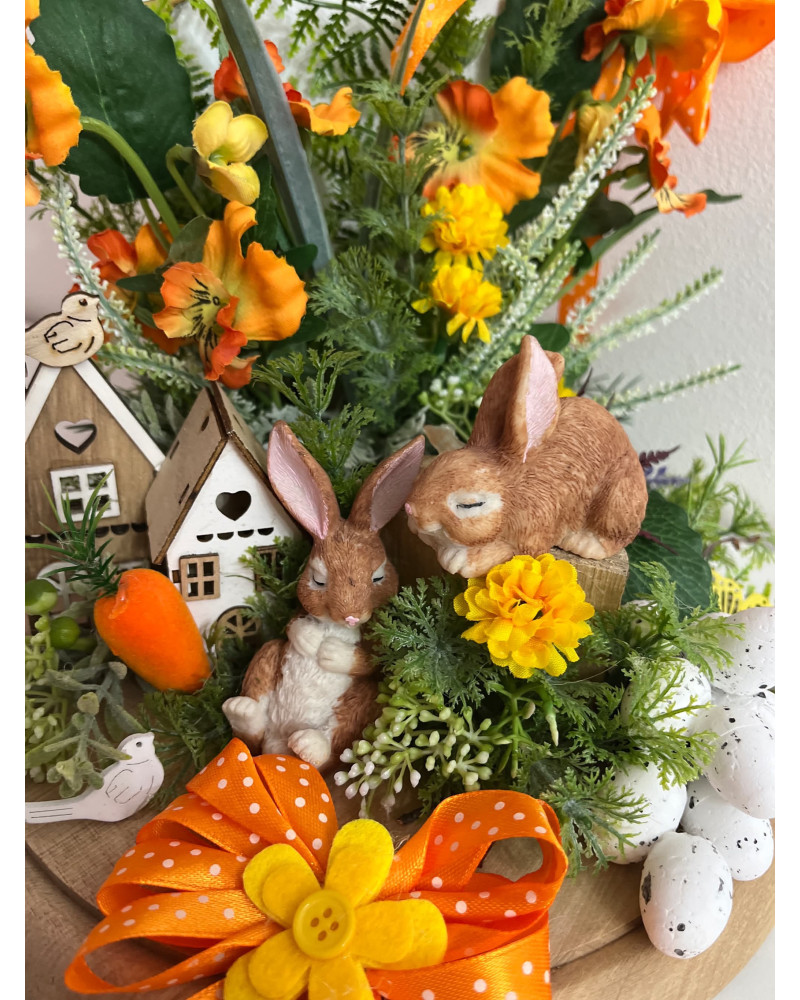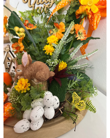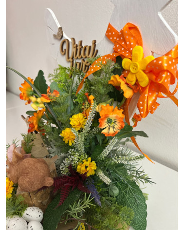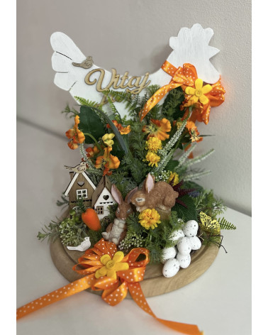 Ikebana so sliepočkou a s dvomi roztomilými zajkami v záplave jarných kvetov s nápisom Vitaj jar.