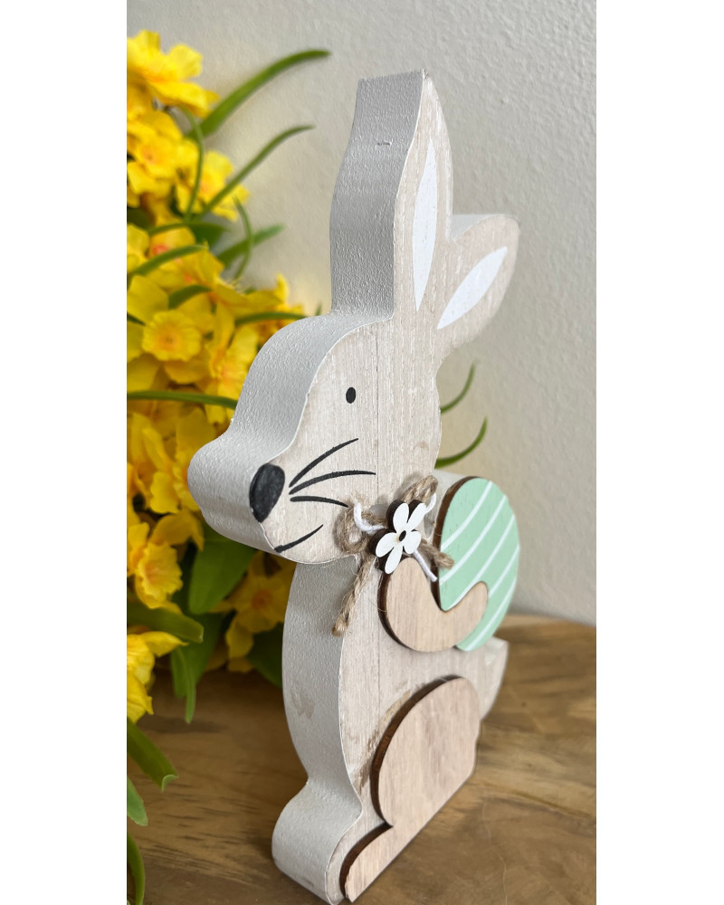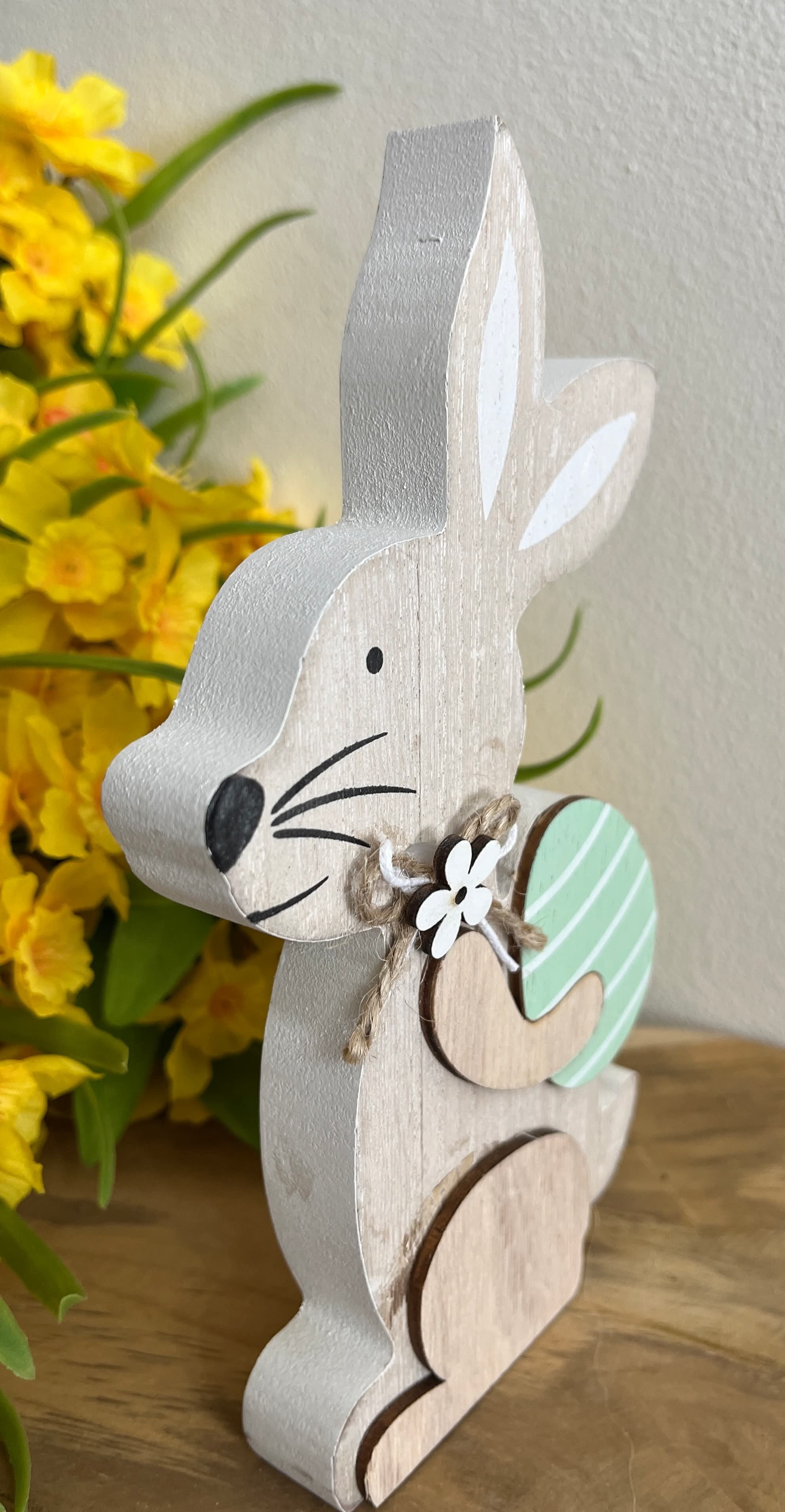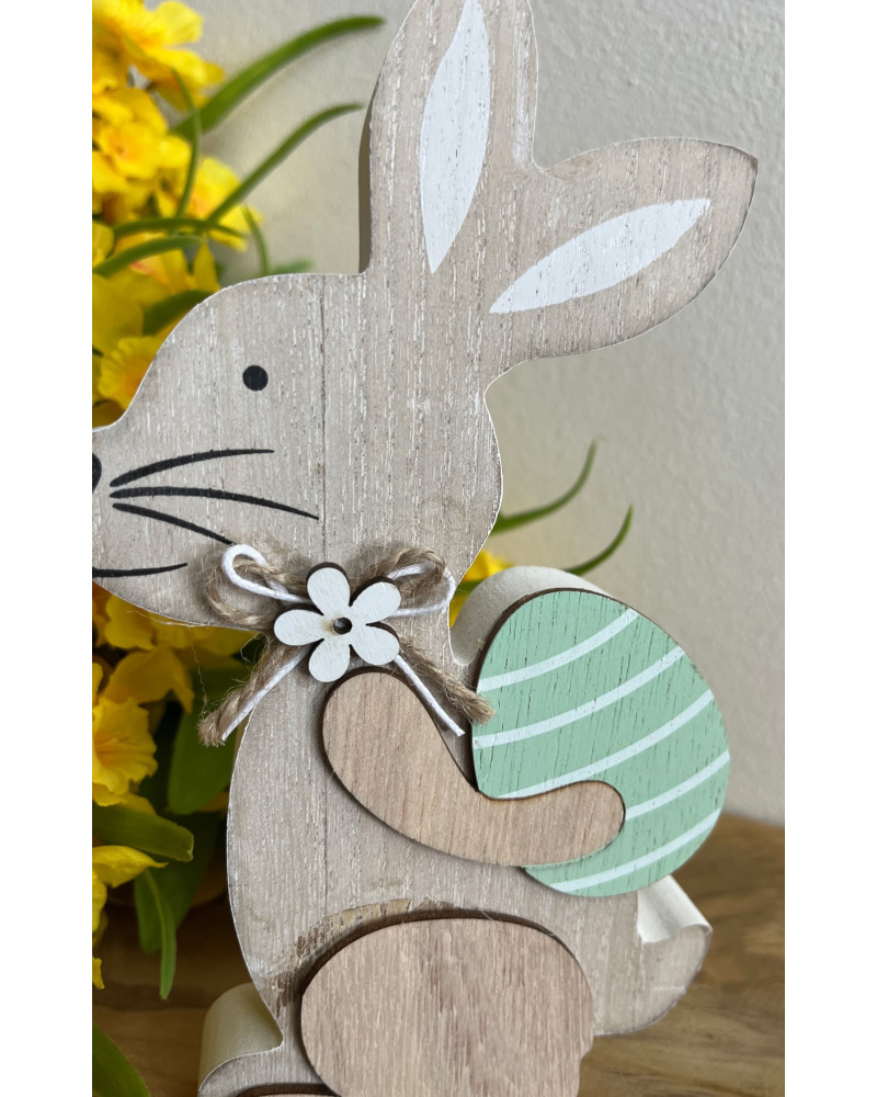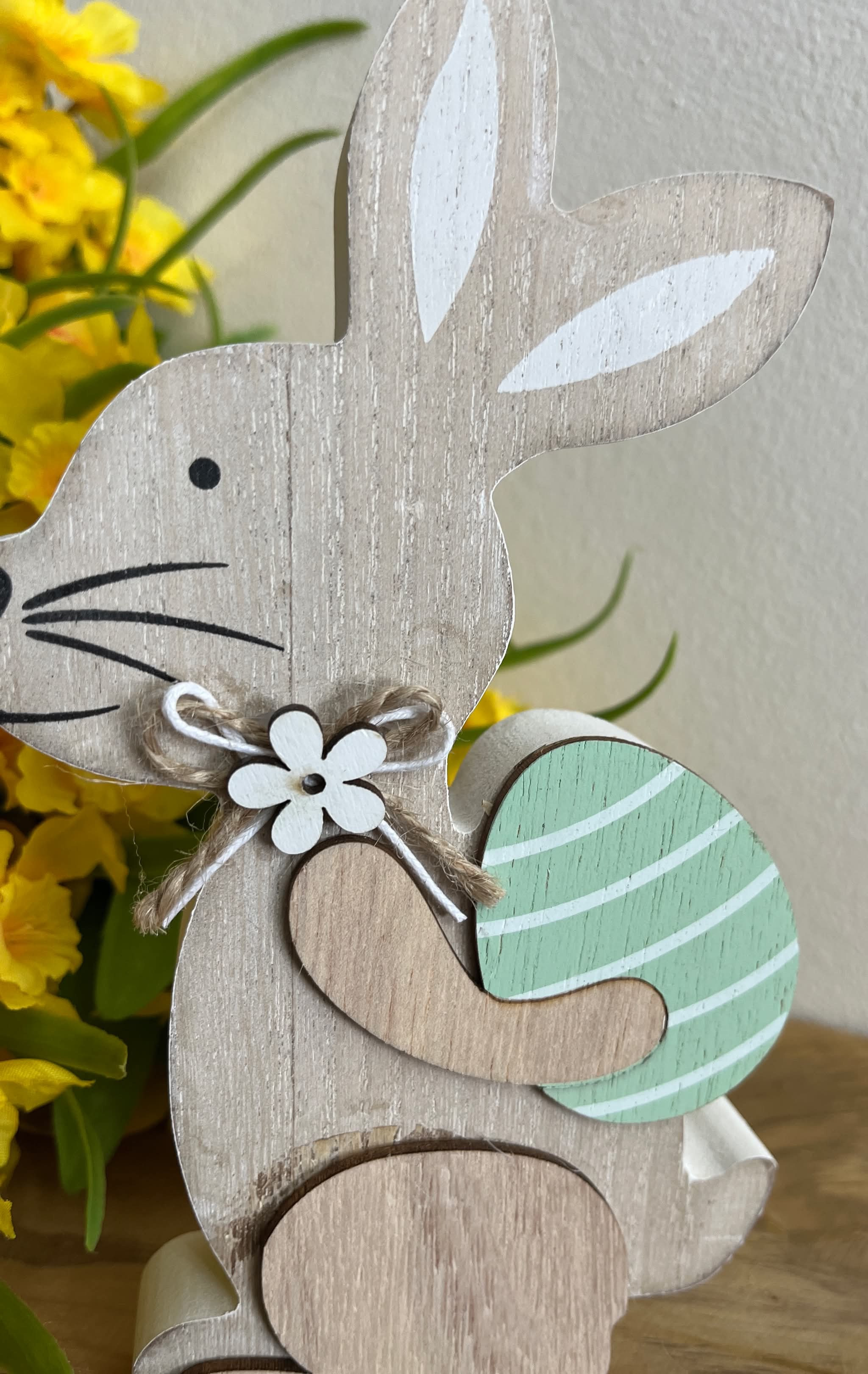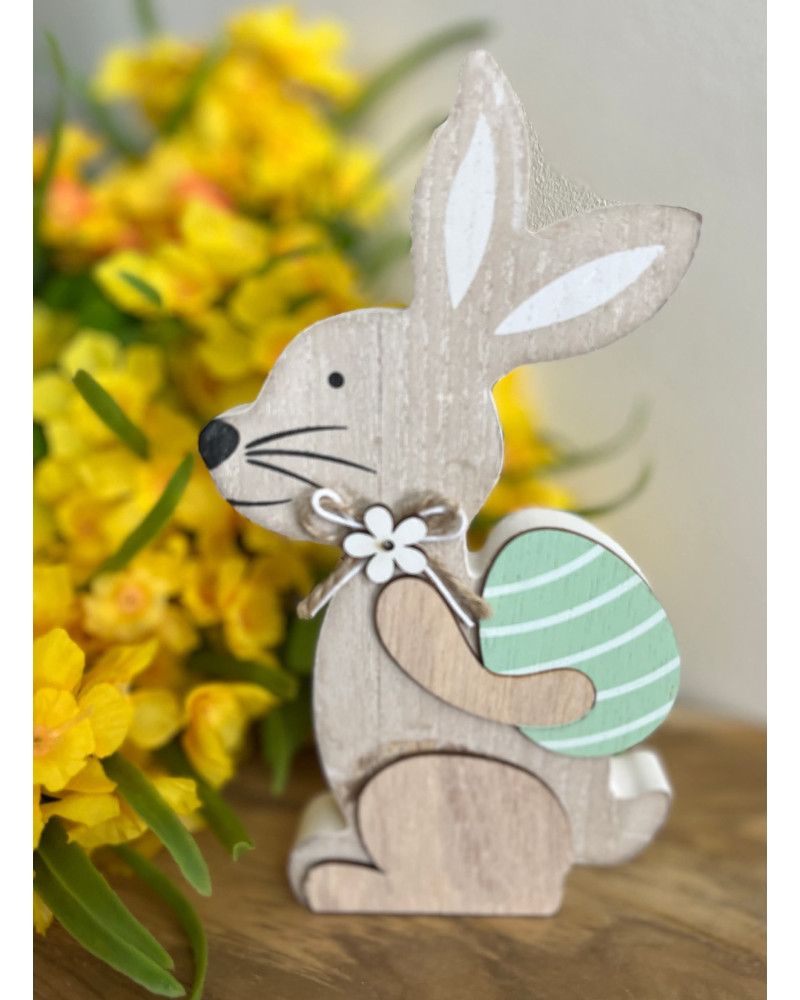 Drevený zajko s vajíčkom jemne zelenej farby.