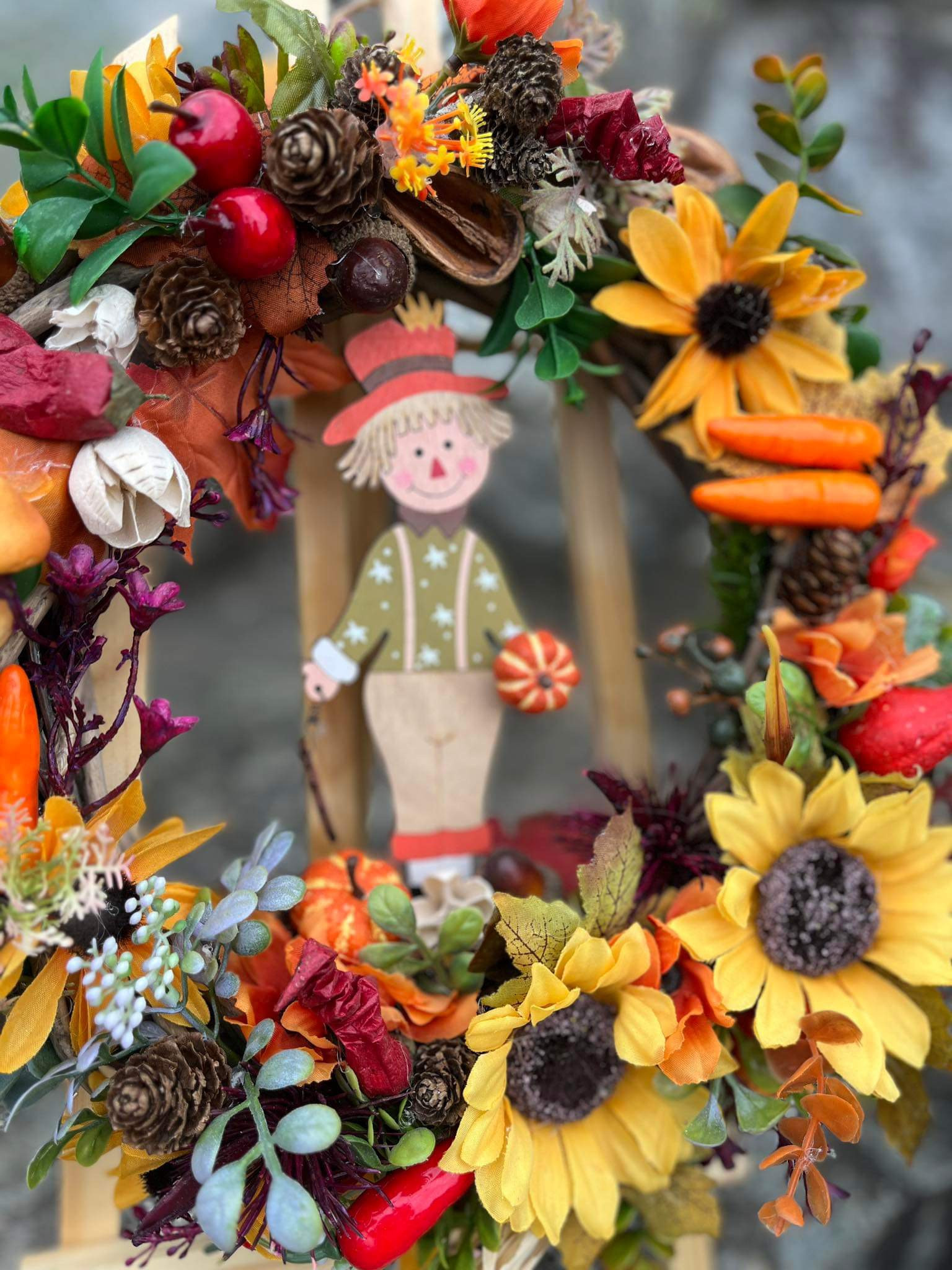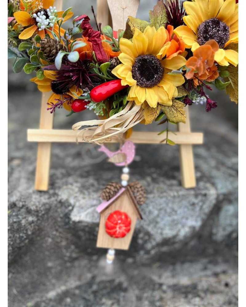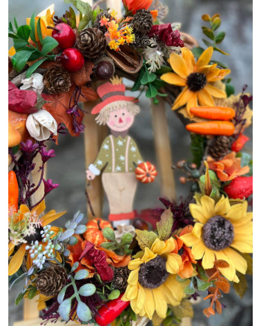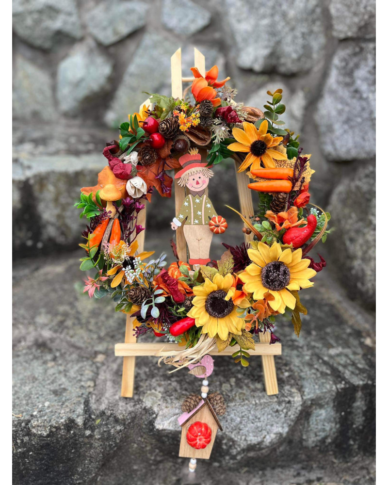 Veniec v typických farbách jesene s dreveným chlapčekom s previsom (drevený domček).