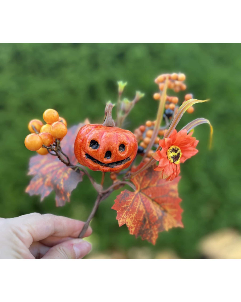 Zápich s vysmiatou umelou tekvičkou a s hrdzavými lístkami. Vhodný na ďalšiu jesennú tvorbu.