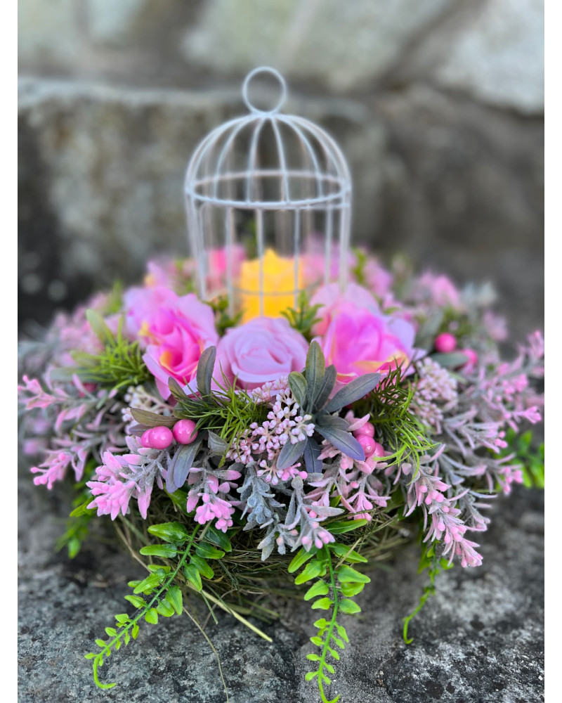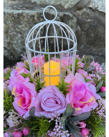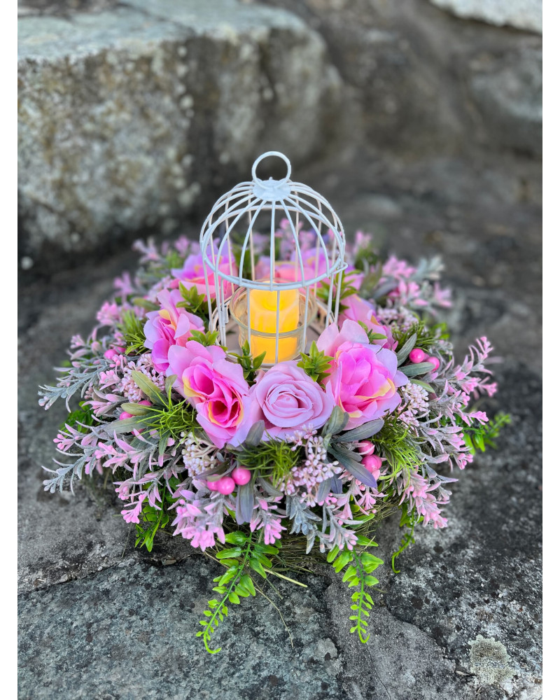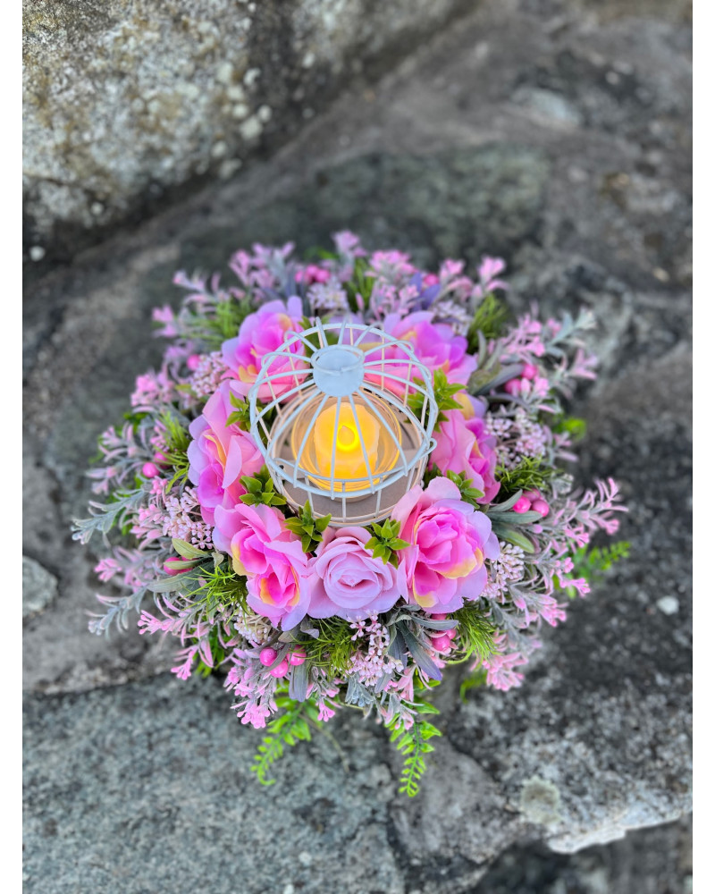 Kvetinový ružový okrúhly svietnik s kovovou klietkou na sviečku s večným svetlom, je robený dookrúhla, takže ideálny na stôl. Sviečka je už súčasťou svietnika.