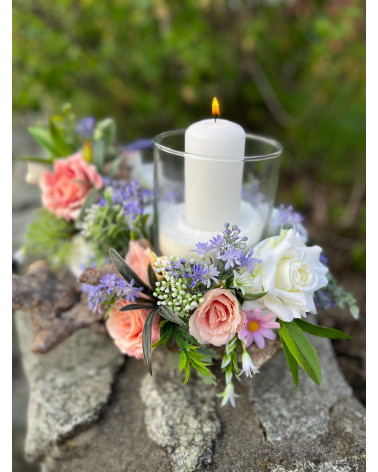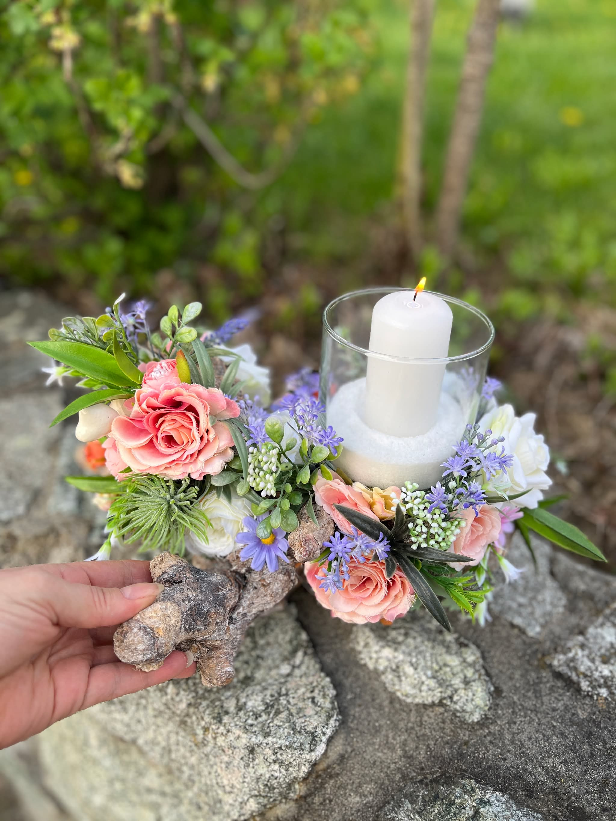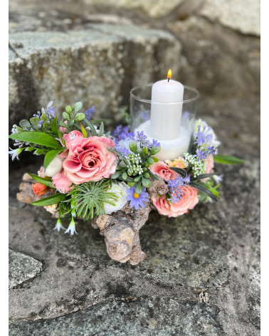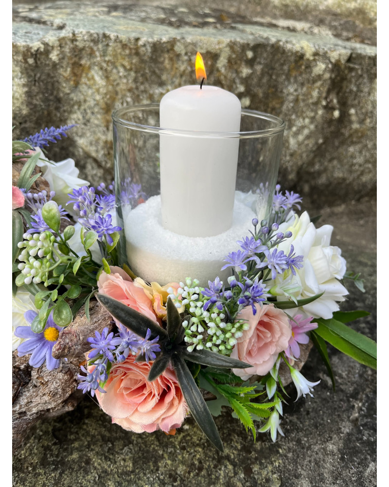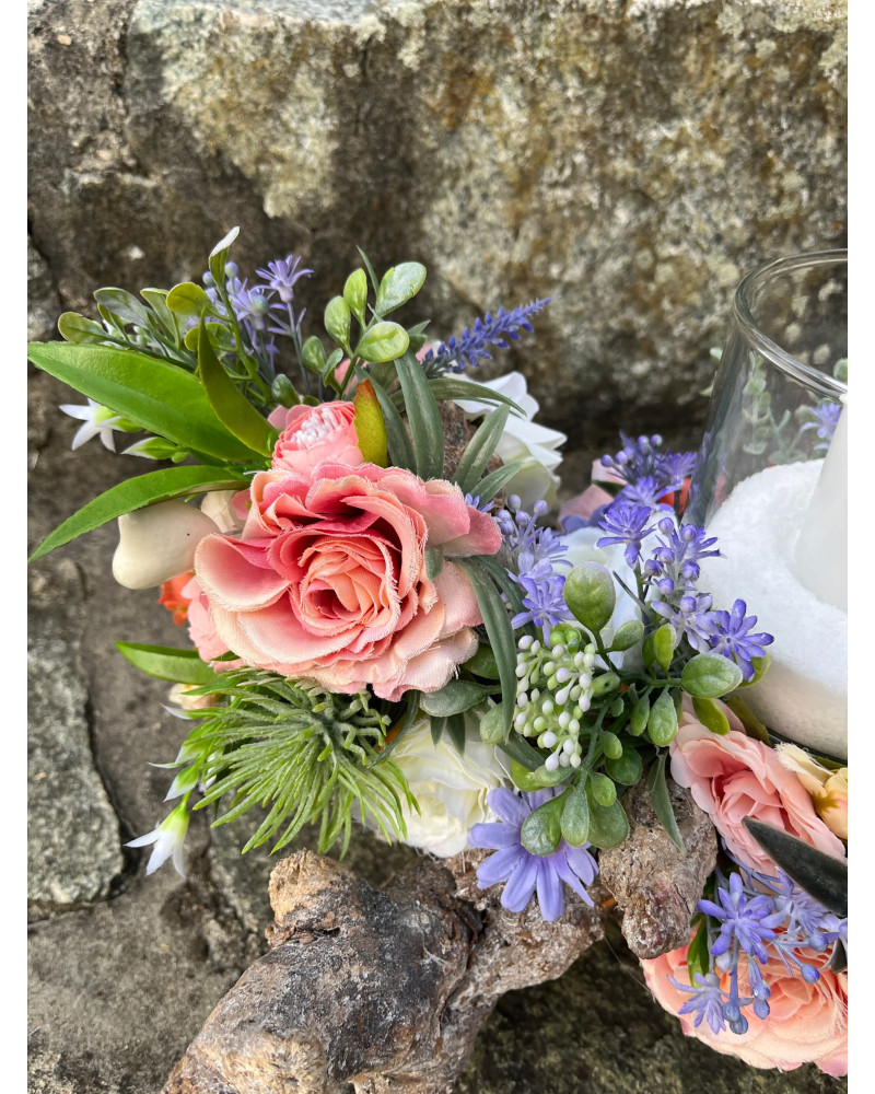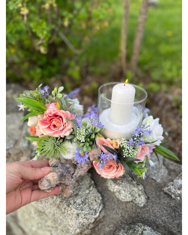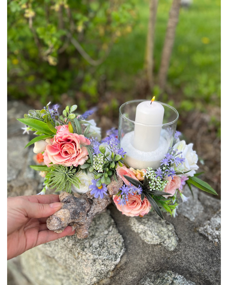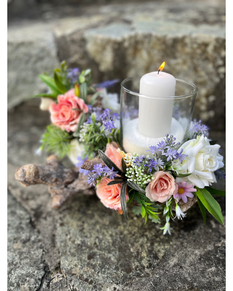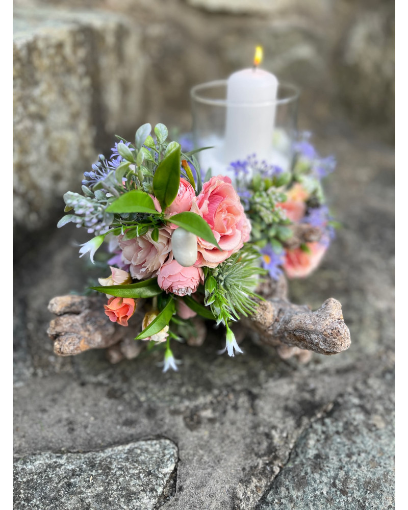 Sklenený svietnik, ktorý nie je napevno pripevnený, aby sa dal čistiť, je osadený v drevenom konári dozdobený s kvietkami v jemných farbách.