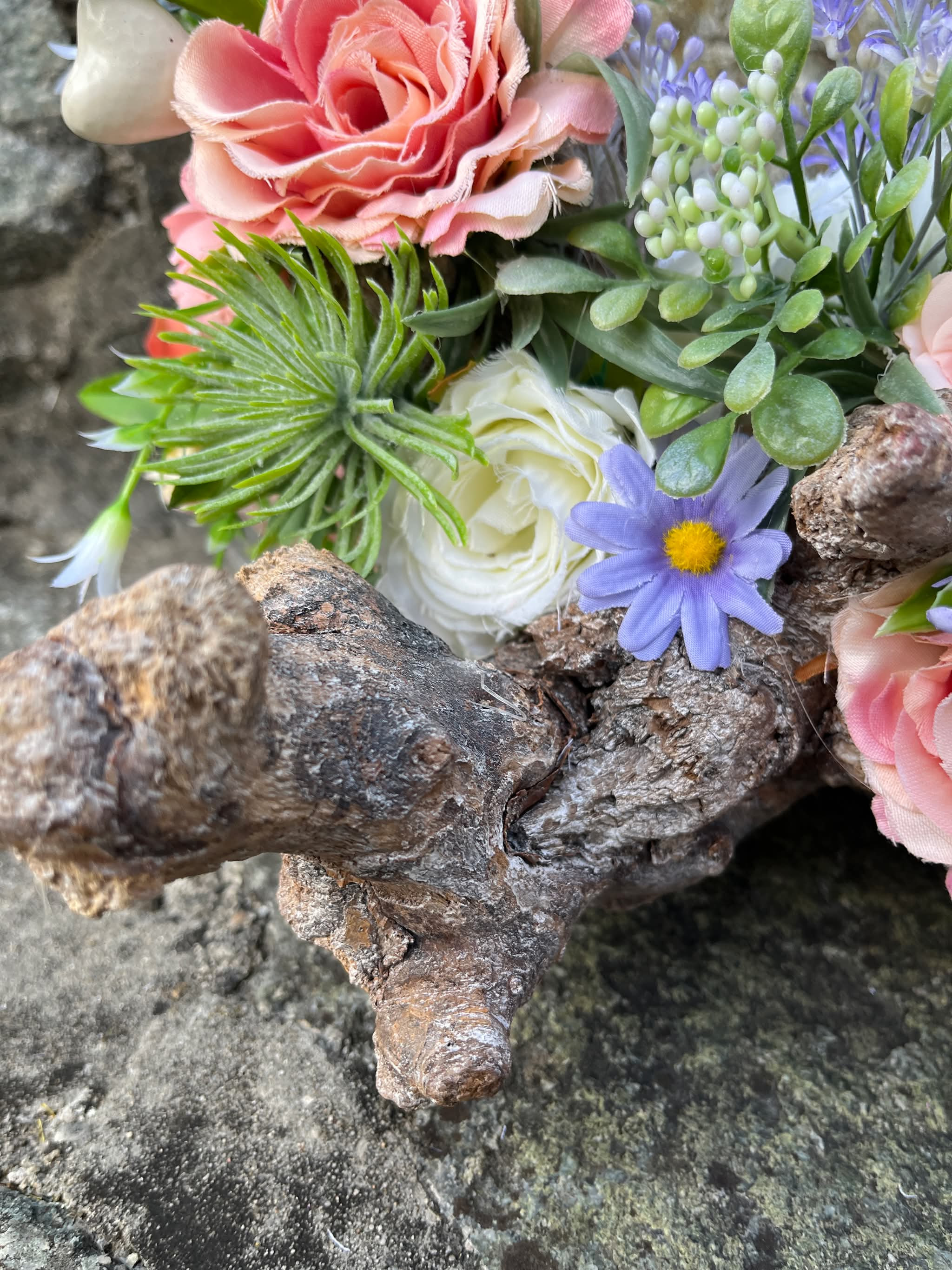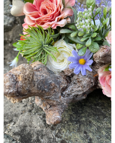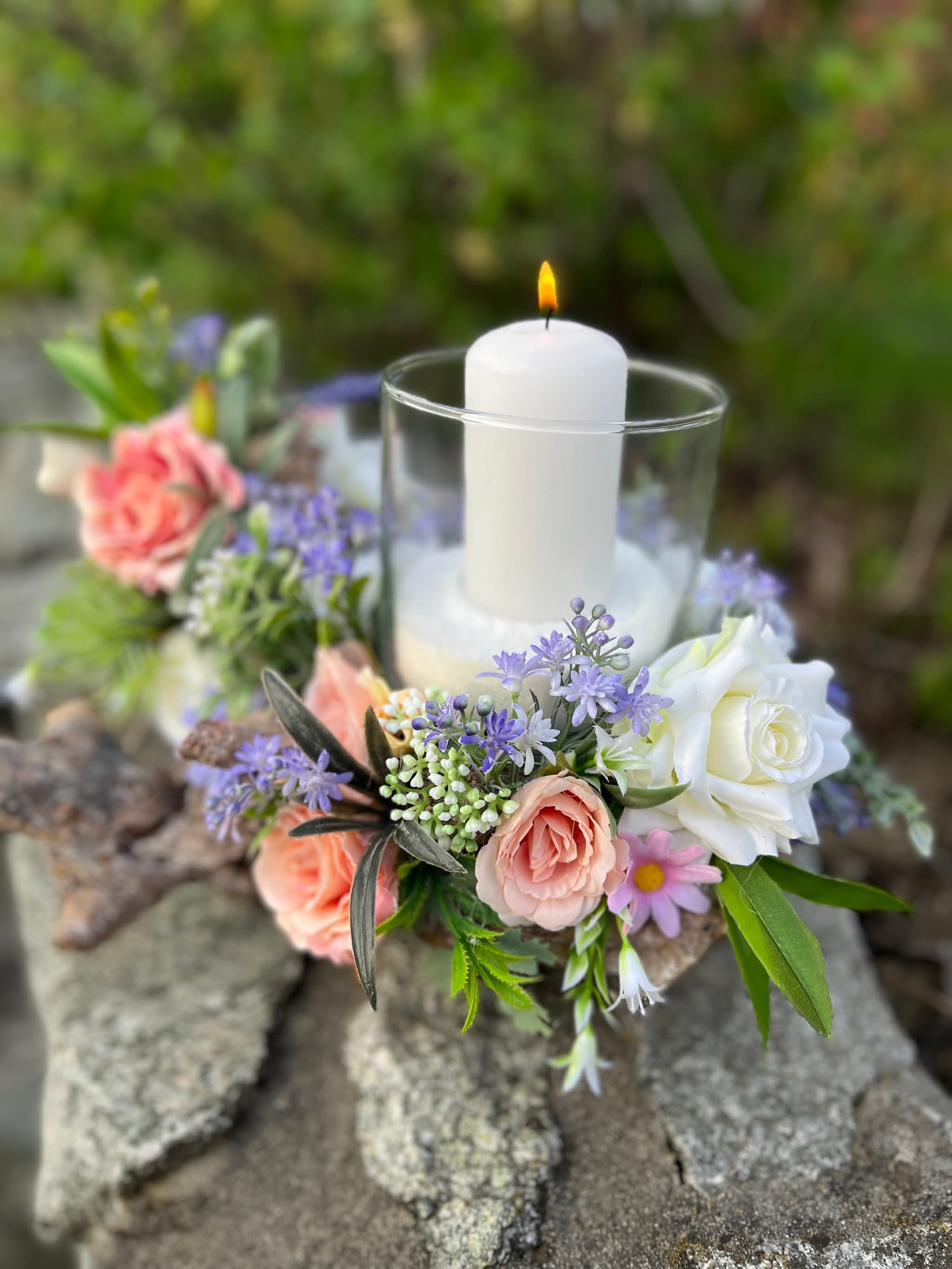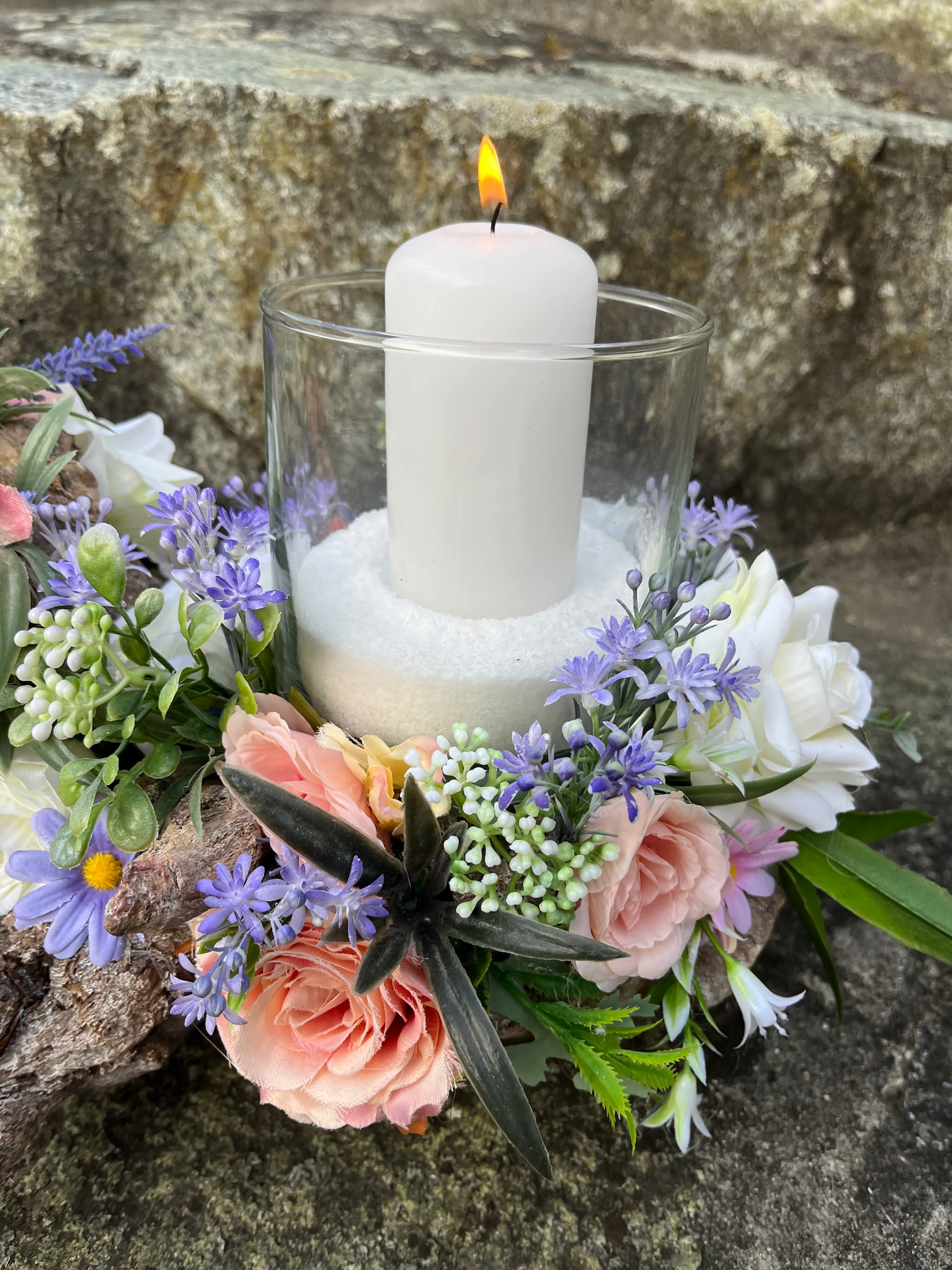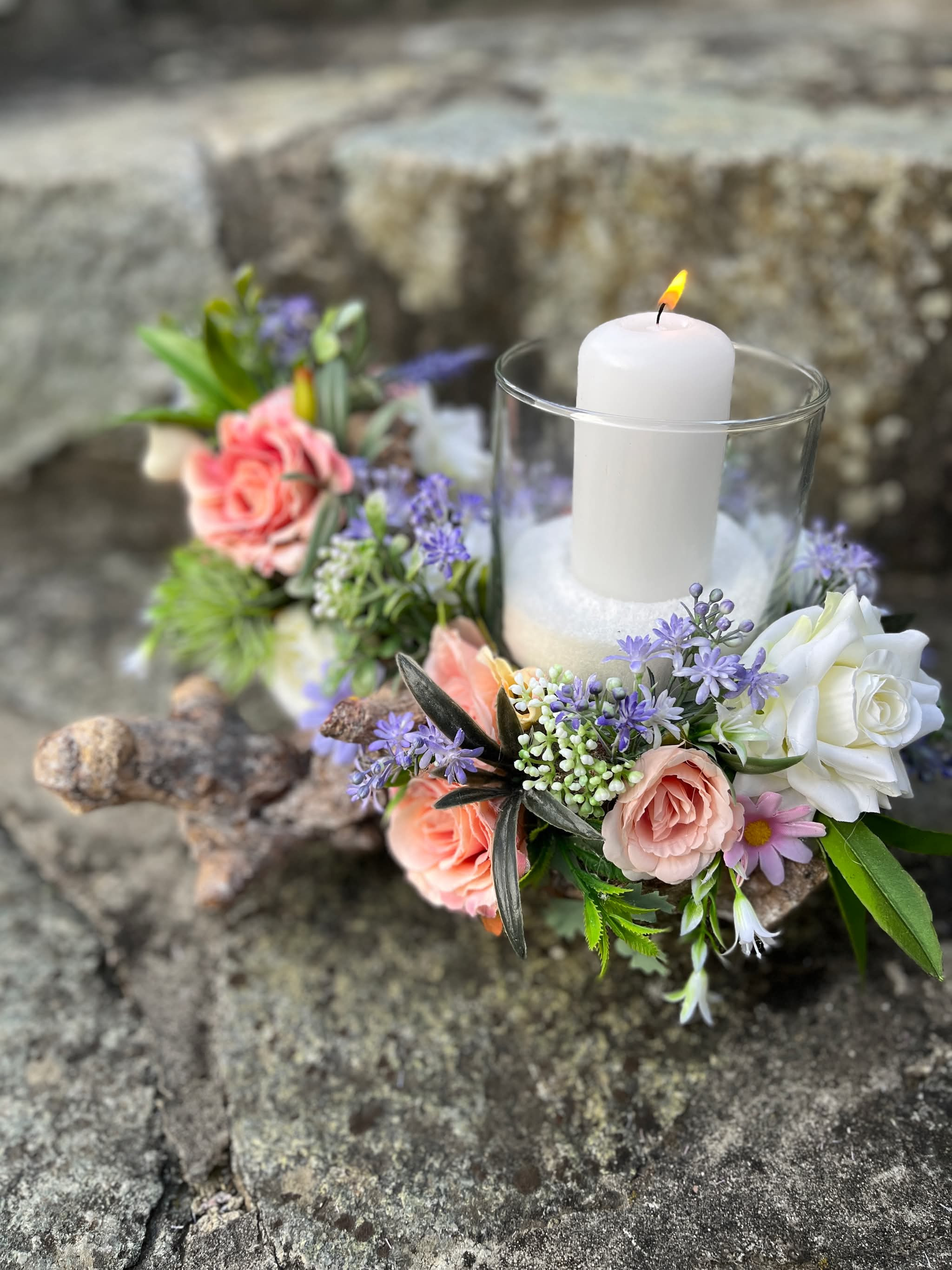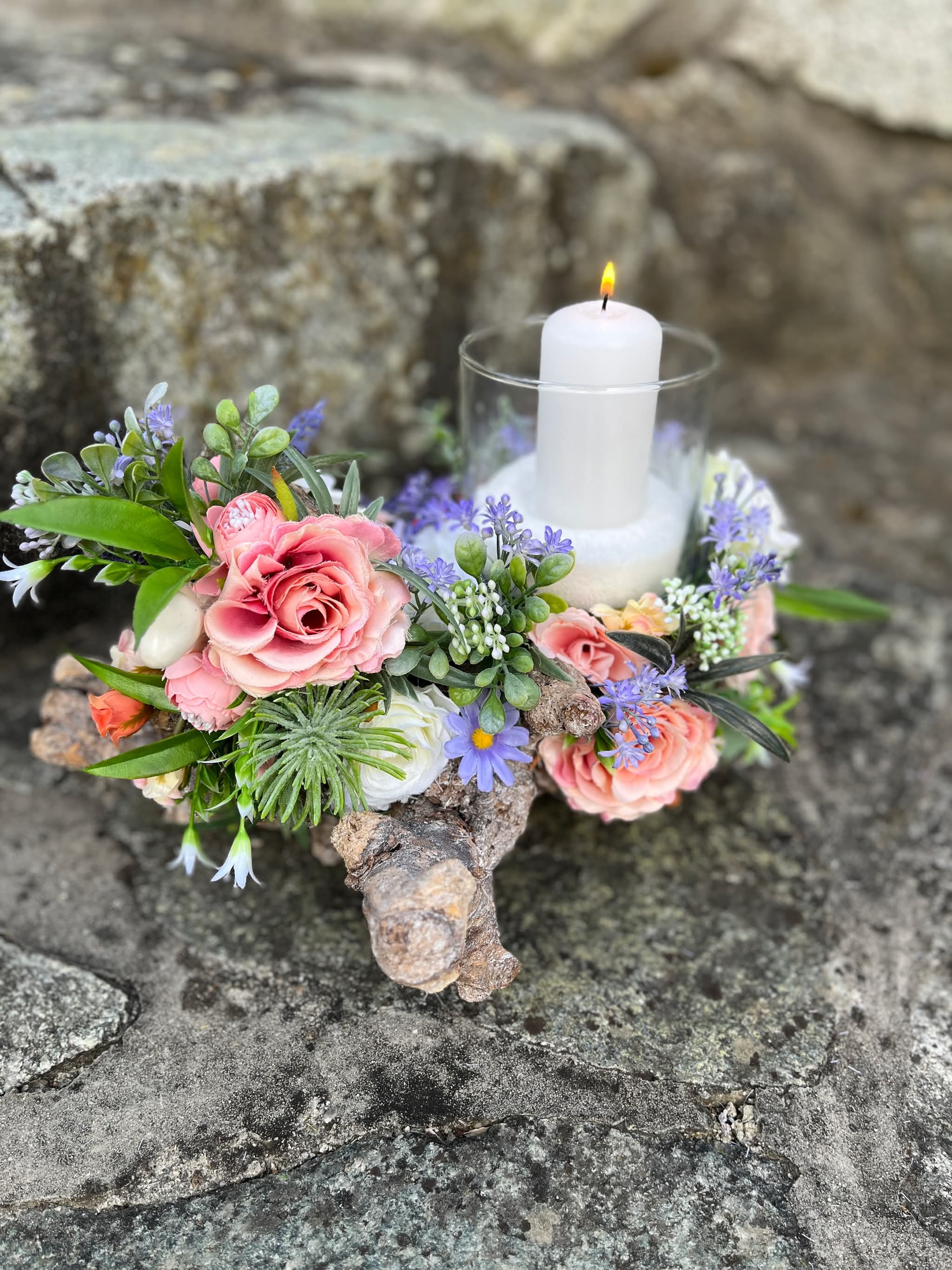 Sklenený svietnik, ktorý nie je napevno pripevnený, aby sa dal čistiť, je osadený v drevenom konári dozdobený s kvietkami v jemných farbách.