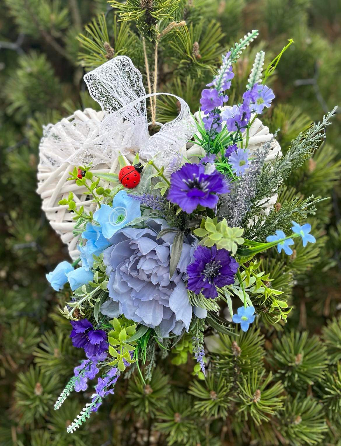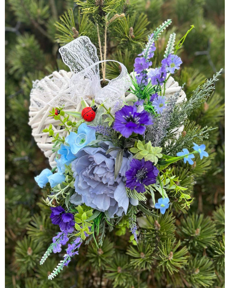 Biele prútené srdiečko doaranzovane s klietkami v odtieňoch modrej, dĺžka 30 cm, výška 30 cm.